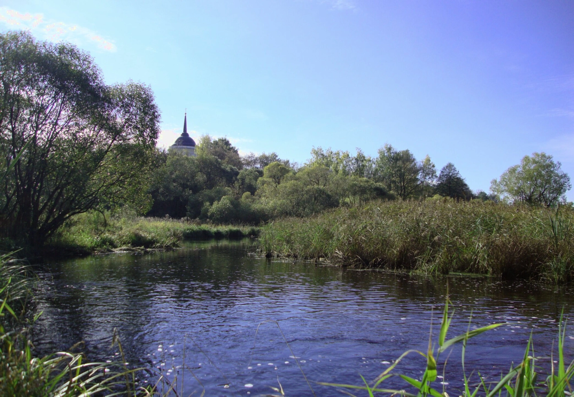 Фото храма Преображения Господня в Балашихе на фоне реки Пехорки