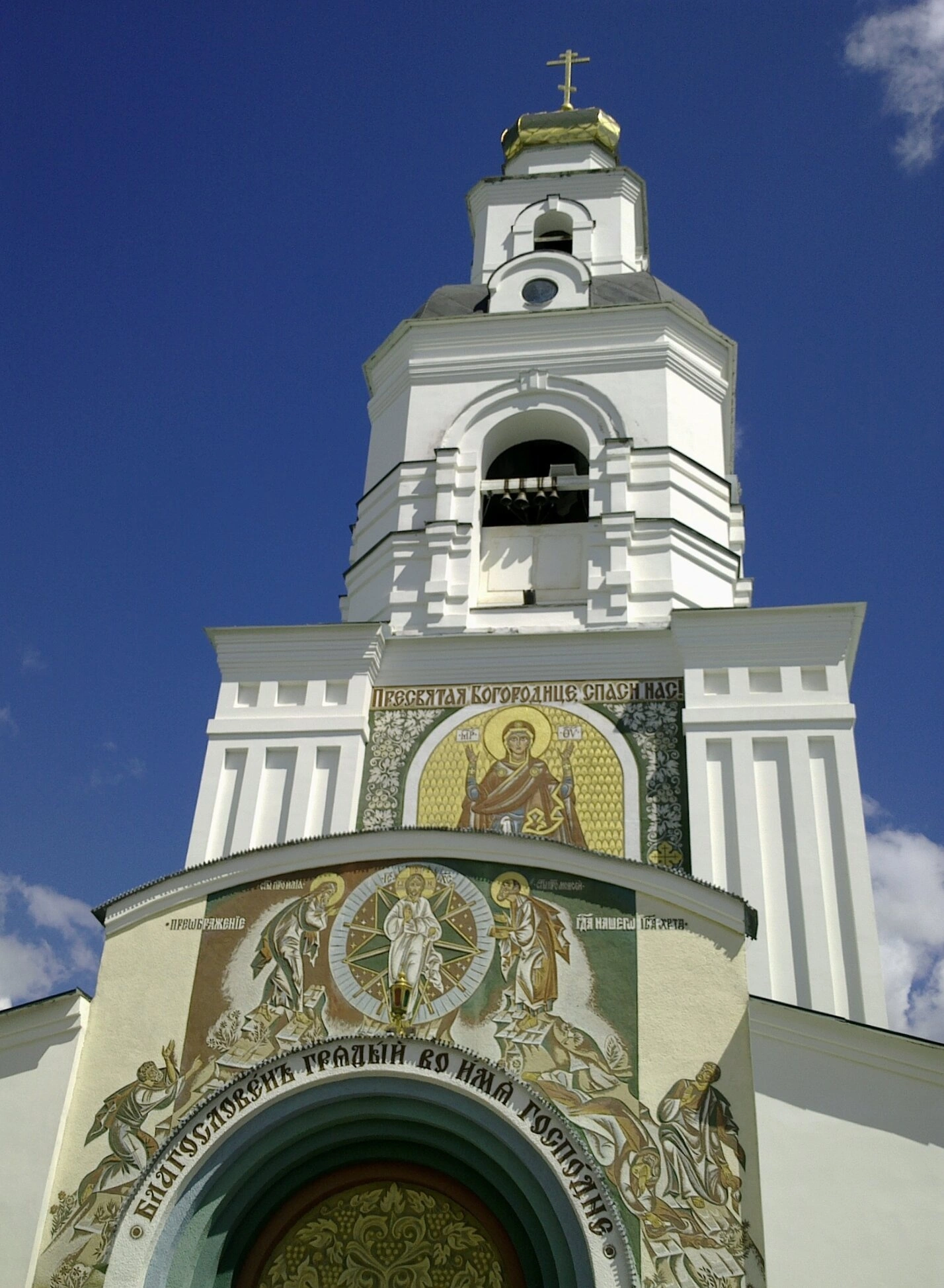 Доминантой композиции выступает стройная многоярусная колокольня, выполненная в светлых тонах и увенчанная златоверхим куполом с вознесённым крестом. Ярусы колокольни украшены арочными проёмами и изящными колоннами, что придаёт всей постройке устремлённость ввысь и лёгкость.