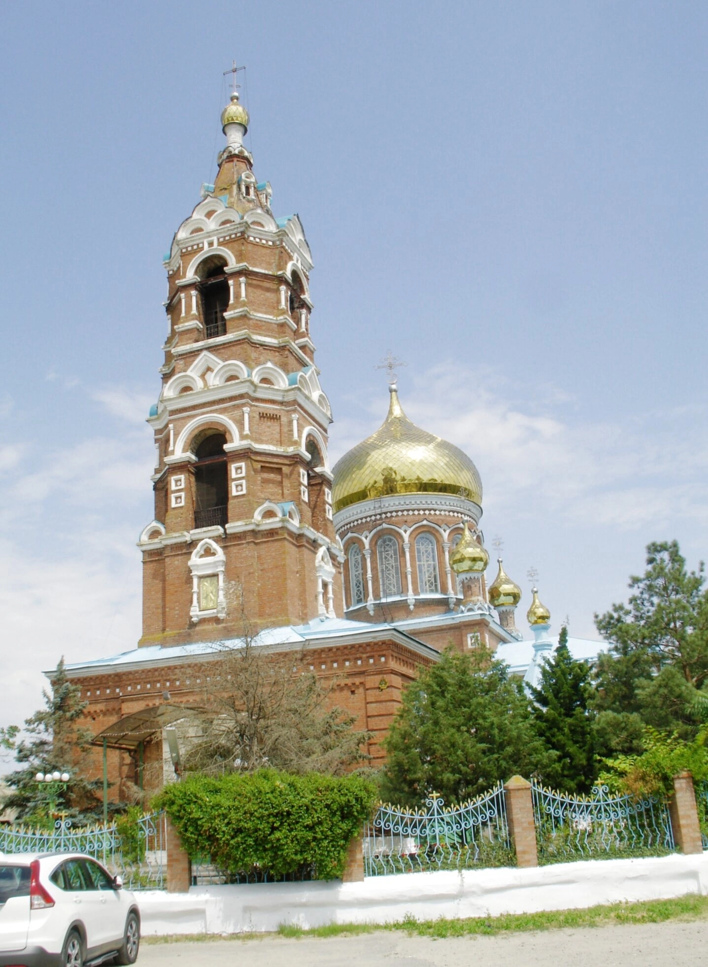 На представленной фотографии запечатлён величественный Храм Преображения Господня, расположенный в хуторе Обуховка Неклиновского района Ростовской области. Этот православный храм, возведённый из красного кирпича, является духовным центром для местных жителей и верующих окрестных поселений. Его архитектурный облик, увенчанный сияющими на солнце золотыми куполами, символизирует устремлённость человеческой души к горнему миру.
