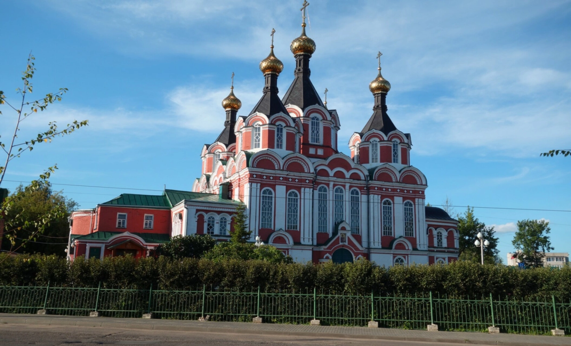 На представленной фотографии запечатлён Спасо-Преображенский собор, православный храм в честь Преображения Господня, расположенный в городе Кимры Тверской области. Снимок позволяет оценить величественный облик этого духовного центра, выполненного в традициях русского церковного зодчества.