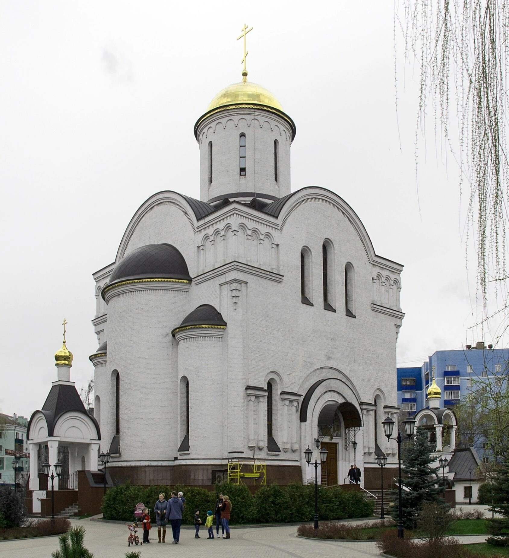 Архитектурный облик храма, с его арочными оконными проёмами и закомарами, отражает лучшие традиции православного храмостроительства. На переднем плане фотографии видна благоустроенная территория с аккуратными дорожками, по которым движутся прихожане — взрослые и дети, что подчёркивает оживлённую духовную жизнь этого места. Зелёные насаждения, кустарники и деревья, в том числе ива с ниспадающими ветвями, обрамляют храм, создавая атмосферу умиротворения и гармонии.