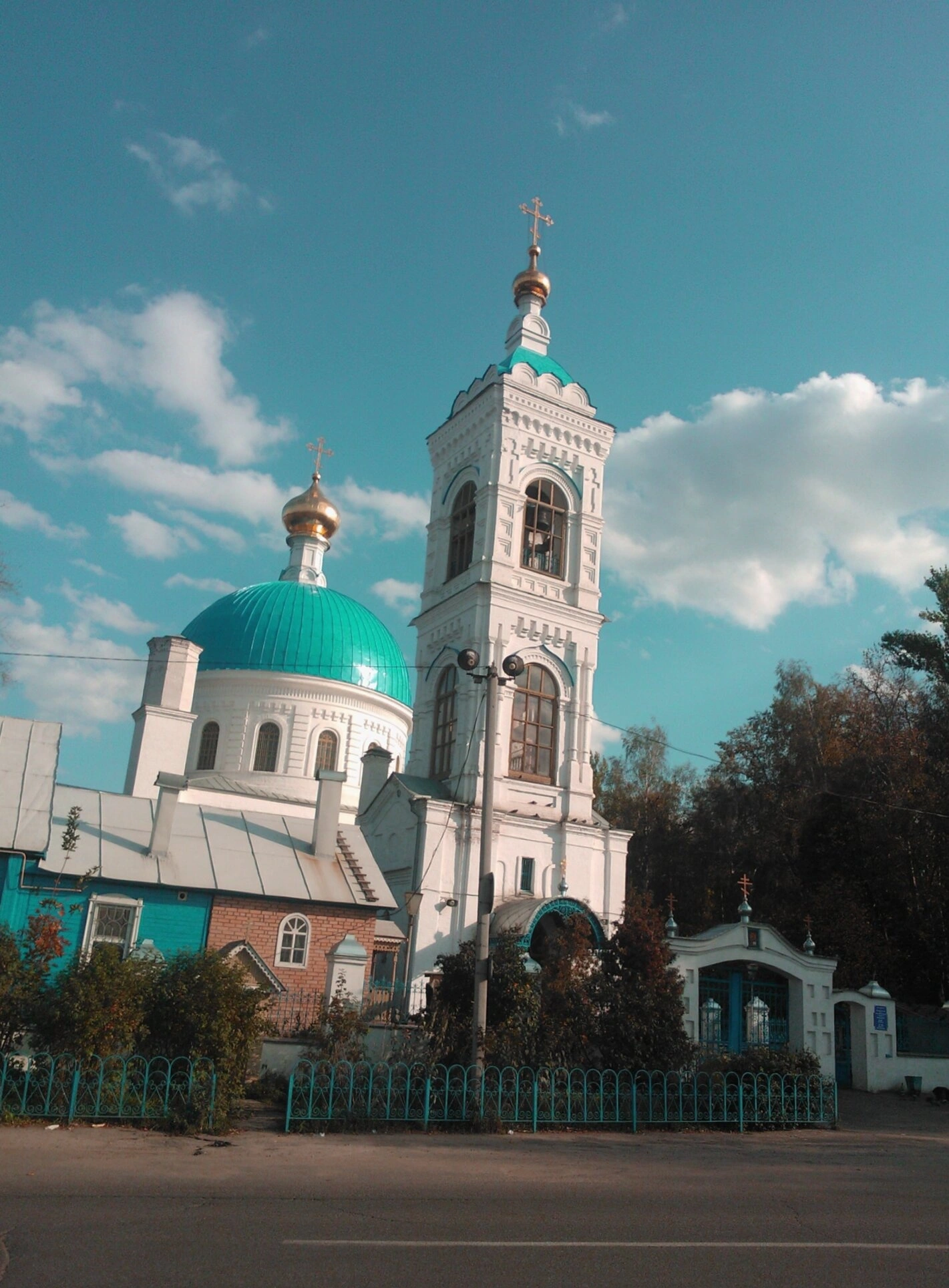 Святыня благоговейно окружена зеленью деревьев, которые служат ей естественным украшением и фоном. Территория храма ограждена аккуратным синим забором, а со стороны дороги видны кованые входные ворота, приглашающие верующих под свои своды. Небесная лазурь с плывущими облаками дополняет этот благостный и умиротворяющий вид, наполняя его Божией благодатью.