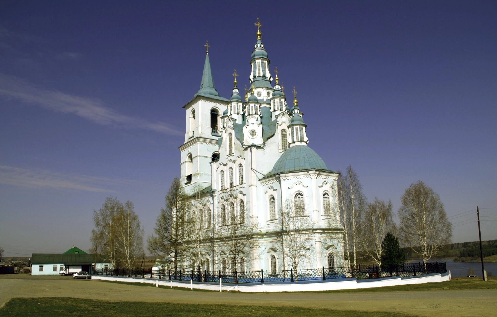 На фотографии запечатлён величественный образ Спасо-Преображенского храма, расположенного в селе Нижняя Синячиха Свердловской области. Этот уникальный памятник русского деревянного зодчества был возведён в 1794 году и освящён в честь одного из двунадесятых православных праздников — Преображения Господня.