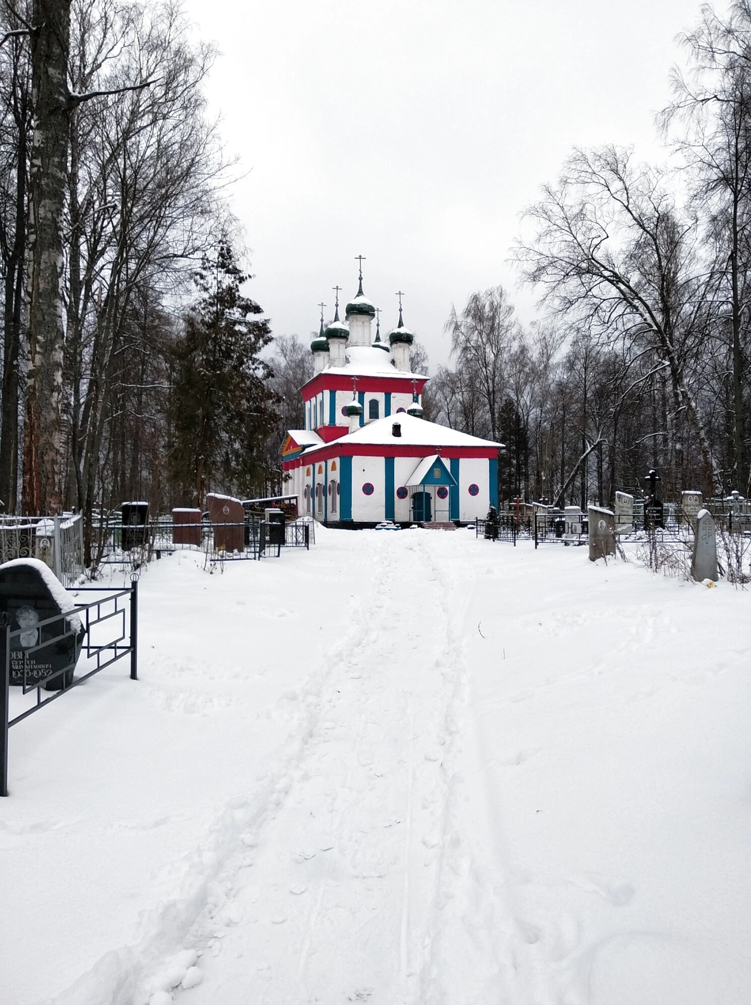 Обитель окружена намоленной территорией старинного кладбища, где покоятся благочестивые предки, что придаёт месту особую духовную значимость. Заснеженные деревья склоняют свои ветви под тяжестью снега, а протоптанная тропинка ведёт верующих к святым вратам храма. Пасмурное небо, типичное для средней полосы России в зимний период, мягко рассеивает свет, подчёркивая строгую красоту и величие православной святыни.