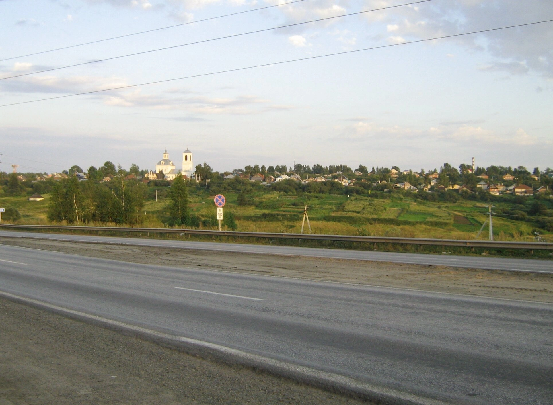 Над всем пейзажем проходят линии электропередач, что говорит о благоустройстве территории. Справа от дороги установлен дорожный знак, регулирующий движение. Фотография передаёт атмосферу мирной сельской жизни, где современность соседствует с вечными ценностями, а дорога буквально ведёт к храму, приглашая путника к духовному отдохновению и молитве.