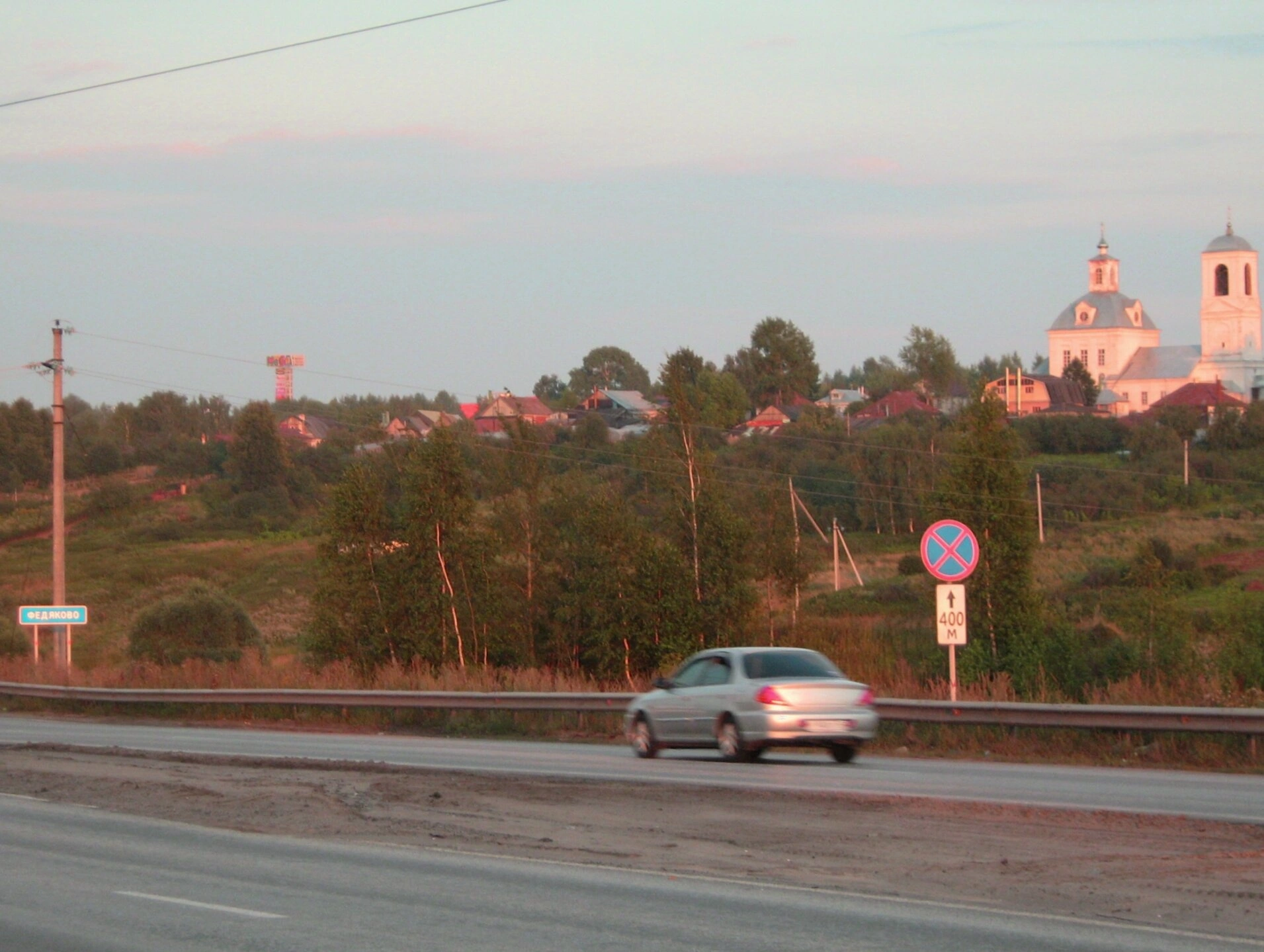 На фотографии запечатлён живописный вид, открывающийся с дороги, ведущей к селу Федяково Нижегородской области. На переднем плане асфальтированная трасса с металлическим ограждением, по которой движется легковой автомобиль. Справа от дороги установлен дорожный знак, запрещающий остановку.