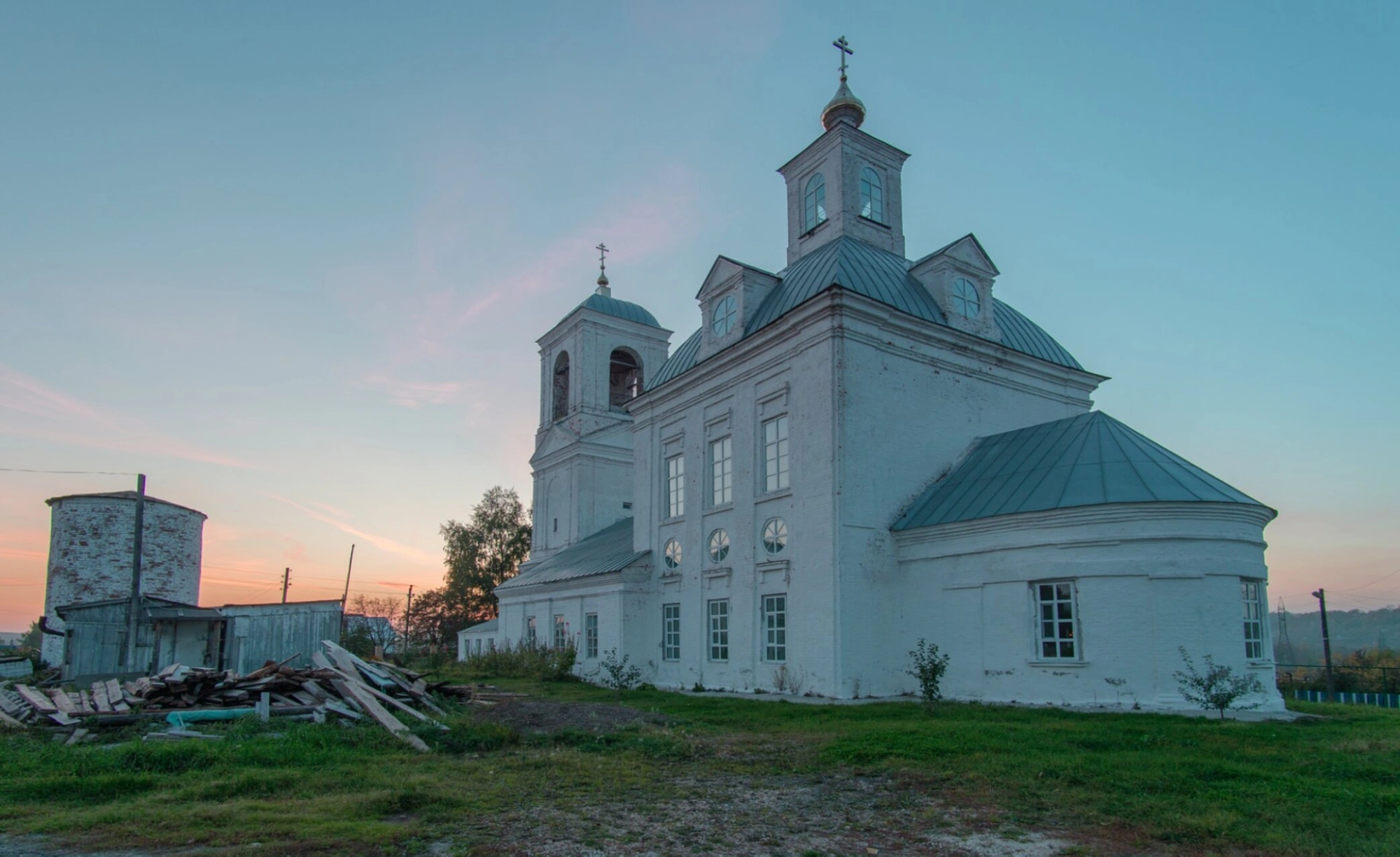На представленной фотографии запечатлён храм в честь Преображения Господня, расположенный в селе Федяково Кстовского района Нижегородской области. Снимок выполнен в час умиротворённых сумерек, когда небо озарено мягкими, благостными оттенками уходящего дня, что придаёт всей композиции особую духовную глубину и величие.