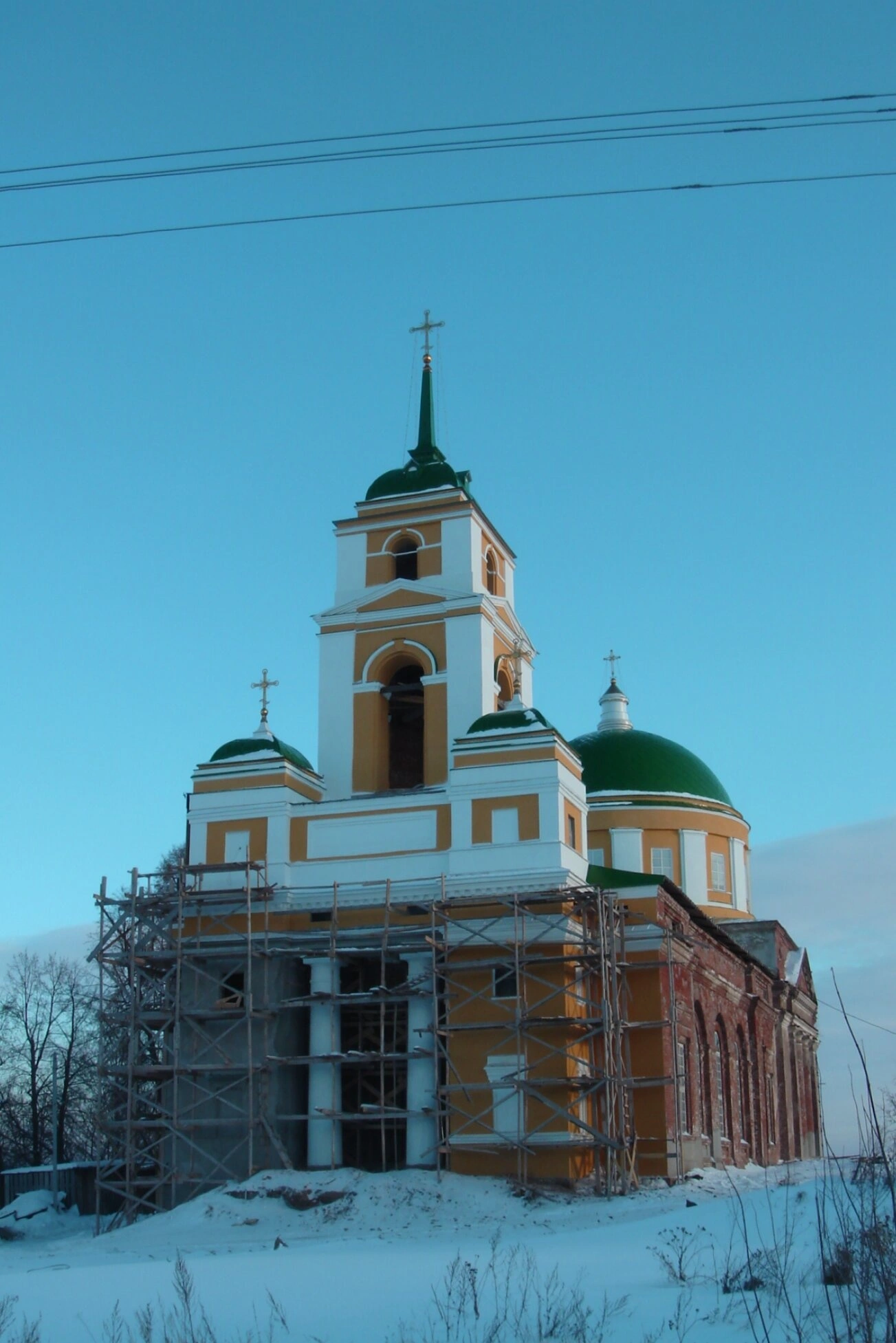 На представленной фотографии из Wikimedia Commons запечатлён храм в честь Преображения Господня, расположенный в селе Мазунино Удмуртской Республики. Снимок документально зафиксировал важный этап в жизни святыни – проведение масштабных реставрационных работ, о чём красноречиво свидетельствуют установленные строительные леса.
