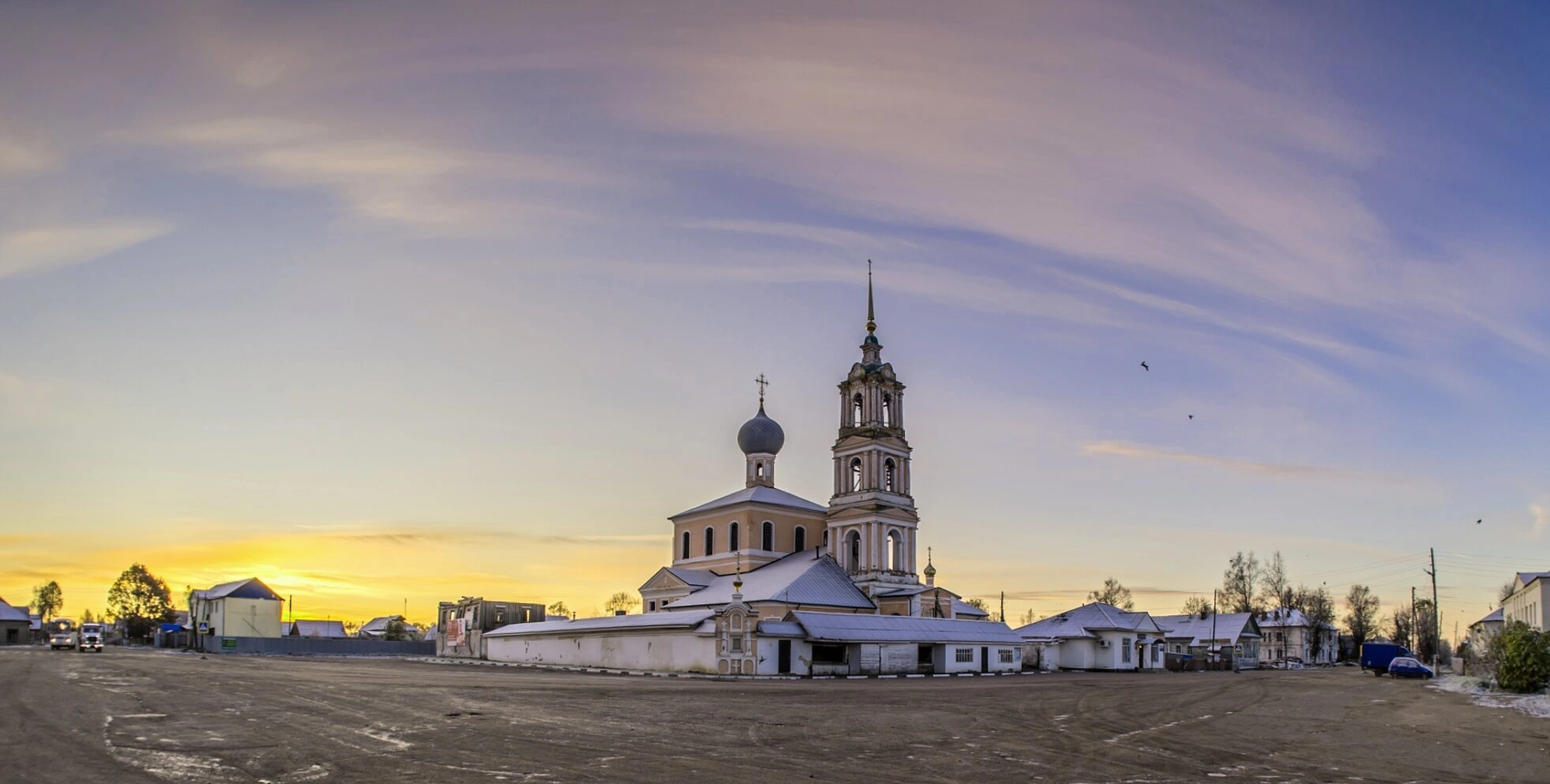 Фотография передаёт умиротворённый сельский пейзаж, окружающий святыню. Церковь стоит в окружении скромных сельских построек и голых ветвей деревьев, что позволяет предположить, что съёмка велась в преддверии зимы или ранней весной. Мягкий свет закатного или рассветного неба, окрашивающий горизонт в тёплые тона, озаряет белоснежные стены храма, создавая атмосферу благоговейной тишины и духовного покоя. Этот свет словно напоминает о самом Преображении Господнем на горе Фавор, когда Божественный свет осиял апостолов.