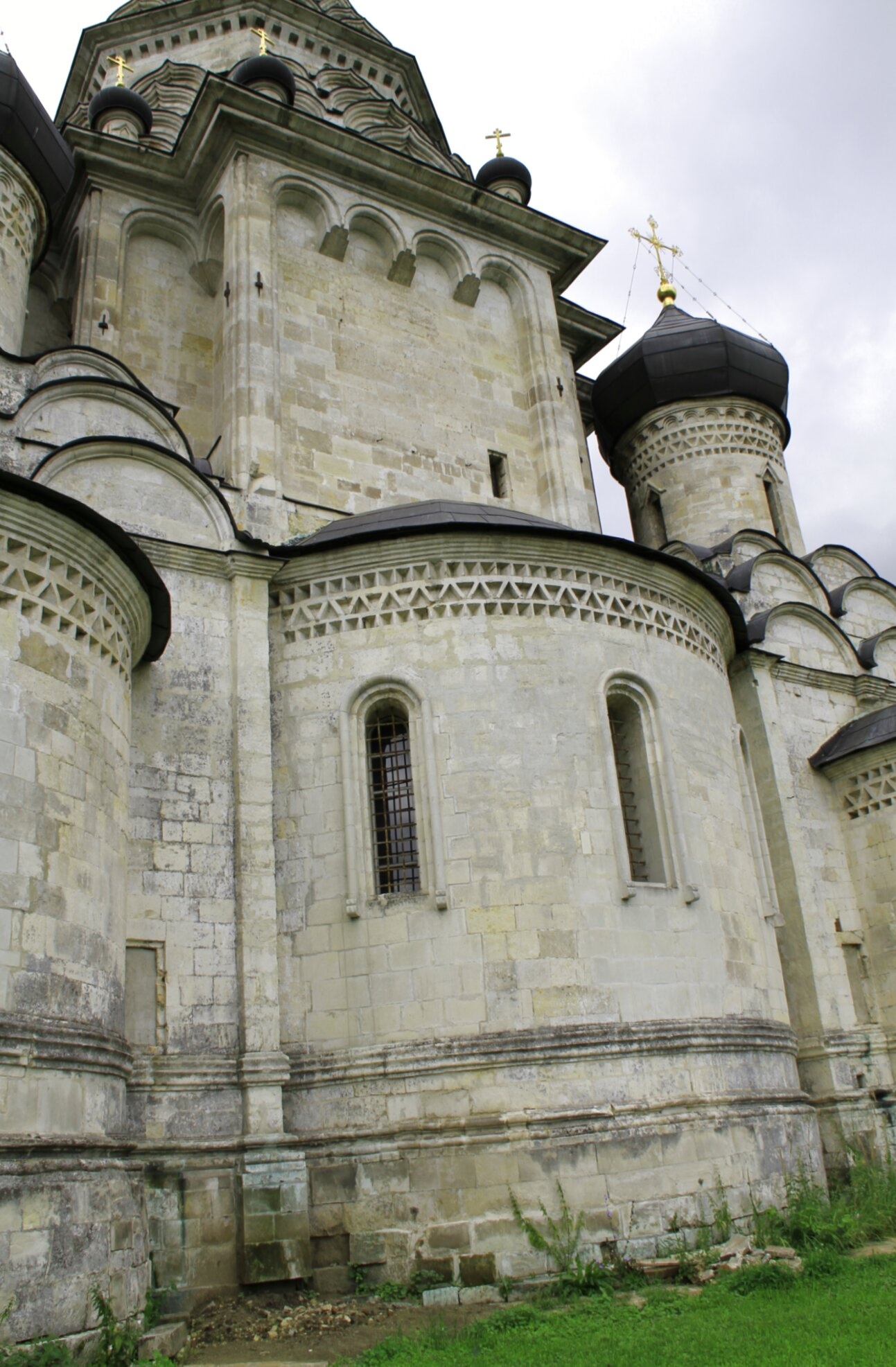Фотография позволяет детально рассмотреть монументальный белокаменный объём храма, его мощные стены и устремлённый в небо стройный шатёр, увенчанный золочёной главкой с крестом. Снимок выполнен в ракурсе снизу вверх, что подчёркивает грандиозность сооружения и позволяет оценить искусную работу древних зодчих. На фасаде чётко читаются элементы декоративной кирпичной кладки, характерные для XVI века, арочные оконные проёмы с кубоватыми наличниками и сохранившиеся элементы первоначального убранства.