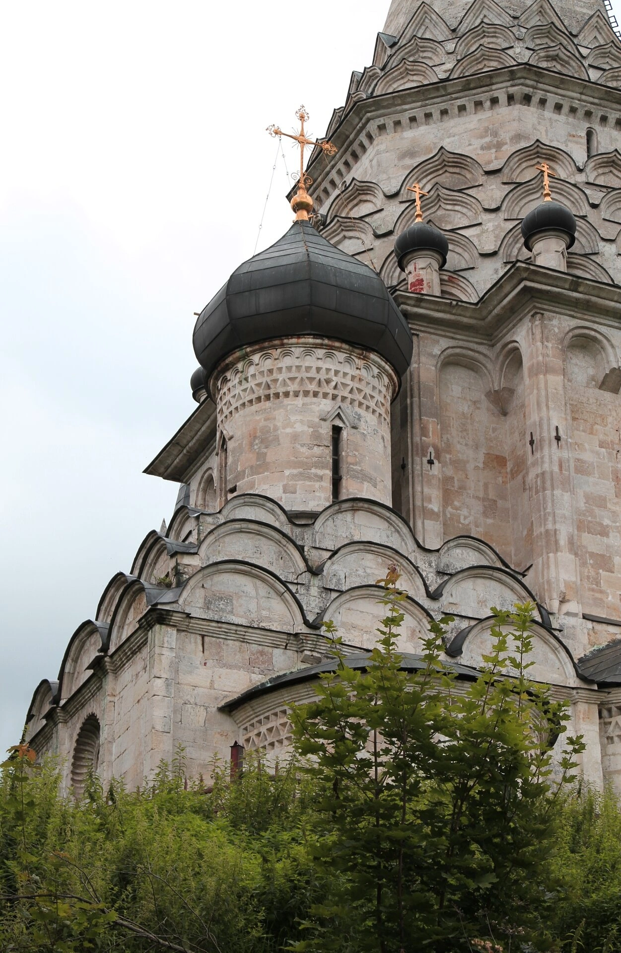 На снимке хорошо просматривается монументальный объём церкви, сложенный из тёсаного белого камня. Центральный шатёр, увенчанный золочёным крестом, горделиво устремляется в небо, символизируя молитвенное горение и стремление к Божественному свету. Рядом возвышается изящная шатровая колокольня, составляющая с основным зданием гармоничный ансамбль. Фасад украшают традиционные для древнерусской архитектуры элементы: аркатурно-колончатый пояс, килевидные кокошники у основания шатра и узкие щелевидные окна, придающие строению строгий и величественный облик.