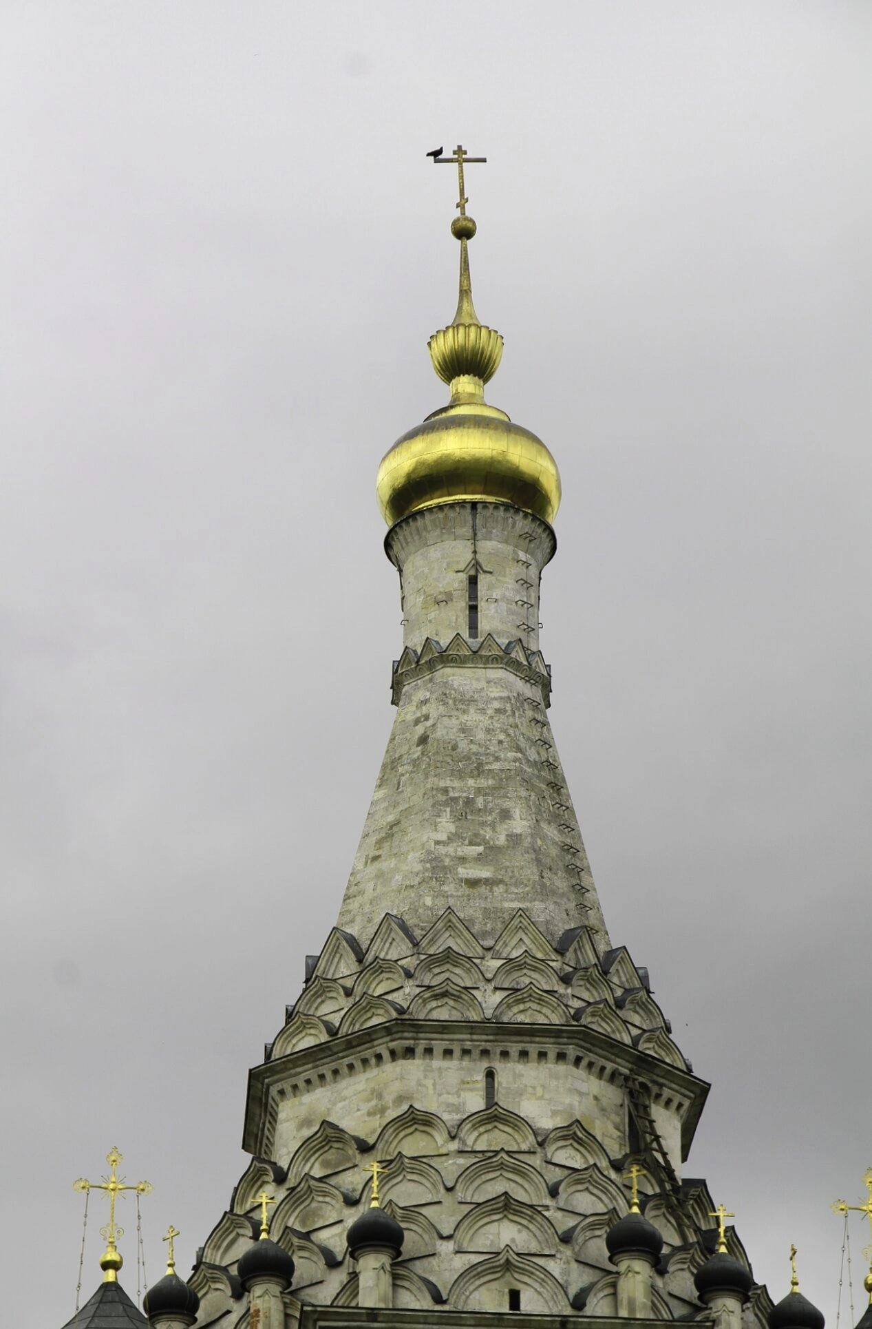 На представленной фотографии запечатлён фрагмент величественного храма Преображения Господня, что расположен в древнем селе Остров Московской области. Данный архитектурный шедевр, возведённый в середине XVI века по повелению царя Иоанна Грозного, является одним из ярчайших образцов русского шатрового зодчества и объектом культурного наследия федерального значения.