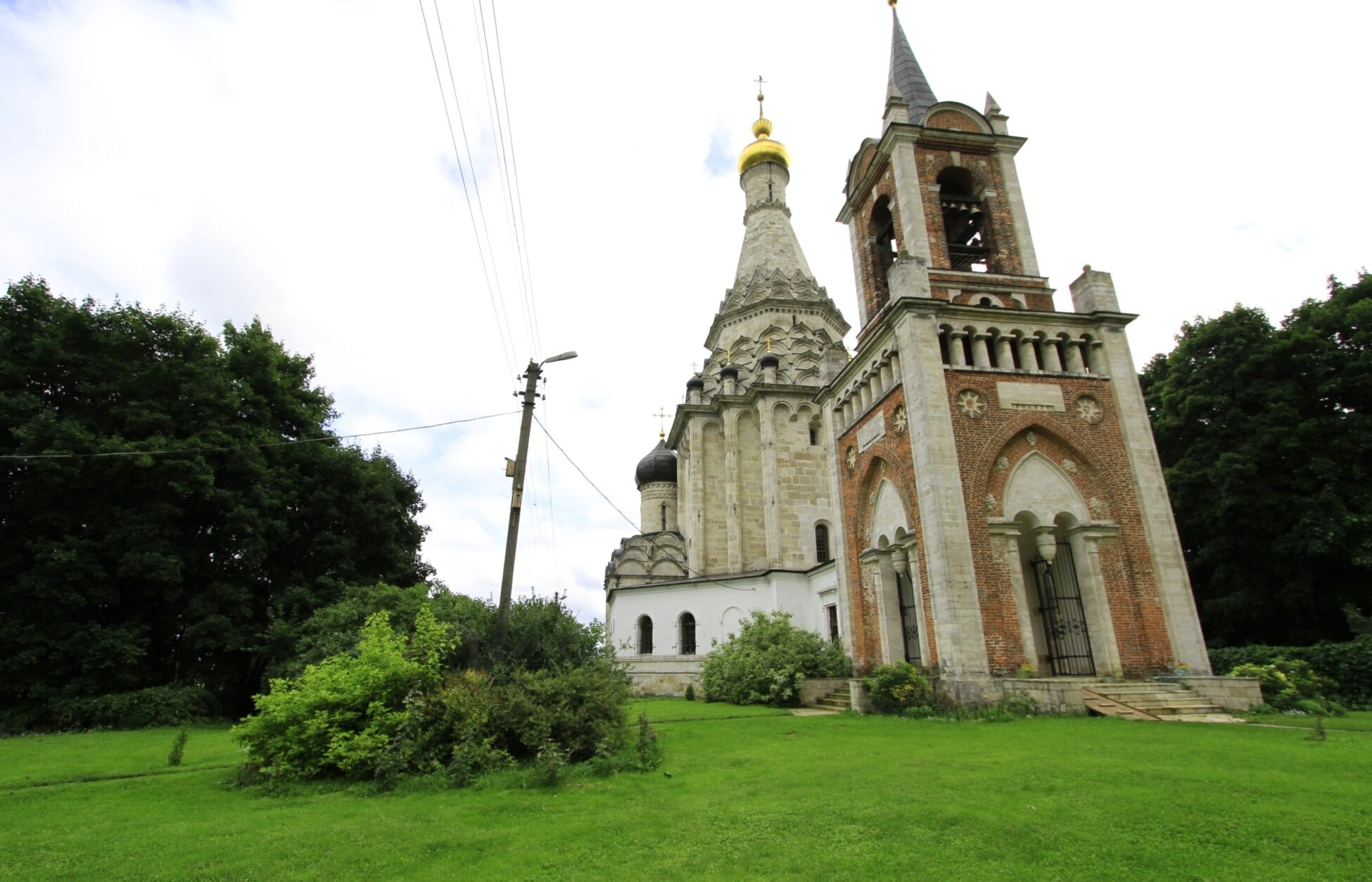 На переднем плане фотографии виден ухоженный зелёный газон, подчёркивающий благолепие и сохранность святыни. Присутствие современных элементов инфраструктуры, таких как столбы электропередач, свидетельствует о том, что древний храм не является музейным экспонатом, а живёт полноценной приходской жизнью в современном мире. Переменная облачность, запечатлённая в небе, мягко рассеивает свет, что придаёт каменным стенам особую пластику и глубину, подчёркивая монументальность и древность этого святого места.
