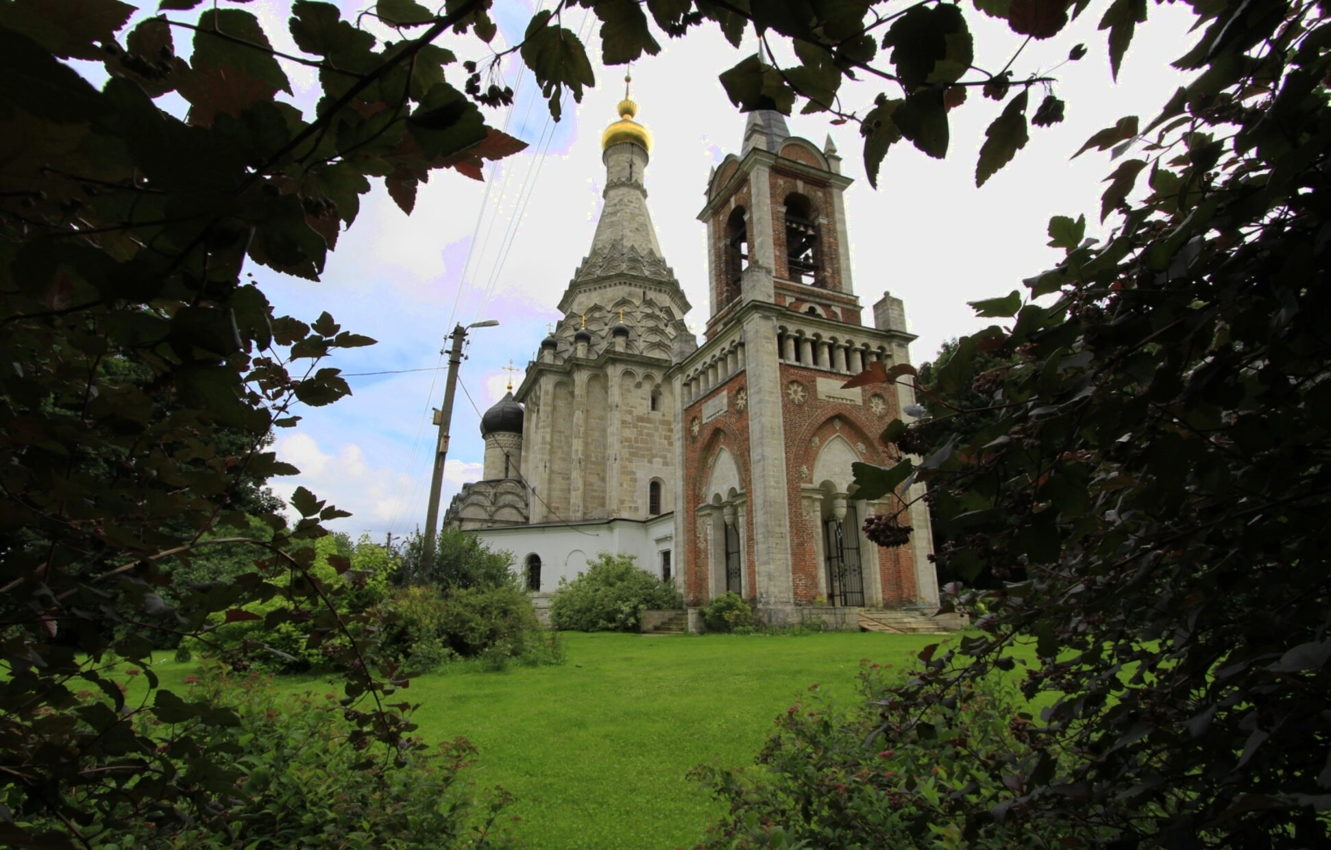На представленной фотографии запечатлён величественный образец русского церковного зодчества — храм Преображения Господня, что расположен в древнем селе Остров Ленинского городского округа Московской области. Этот уникальный памятник архитектуры федерального значения, освящённый в честь одного из двунадесятых праздников — Преображения Господня, по праву считается одной из жемчужин Подмосковья.