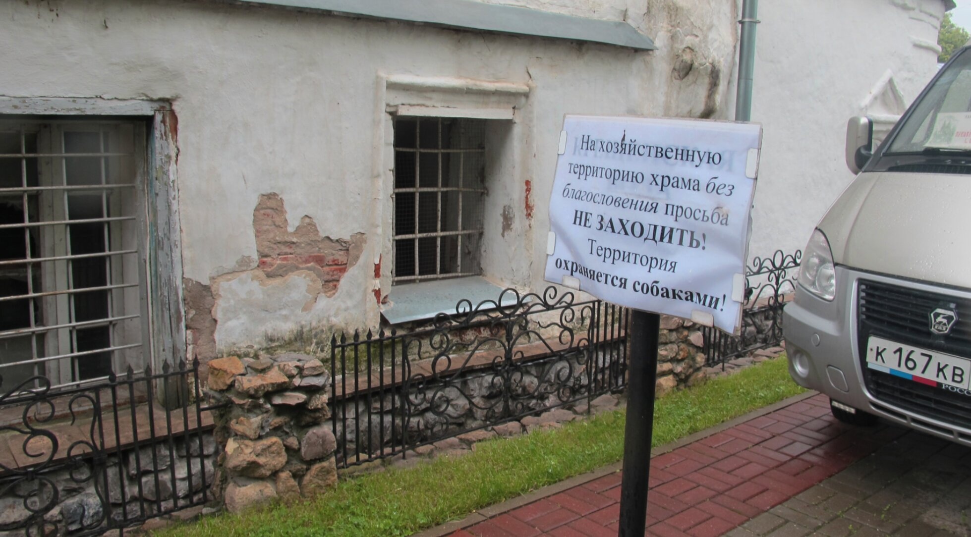 Фасад здания демонстрирует характерные черты храмовой постройки. Окна с арочными завершениями традиционно защищены коваными решётками, что подчёркивает особый статус территории. На переднем плане чётко видна предупреждающая табличка, которая гласит: «На хозяйственную территорию храма без благословения просьба НЕ ЗАХОДИТЬ! Территория охраняется собаками!». Это указание предназначено для обеспечения благоговейной тишины и порядка на церковном подворье.