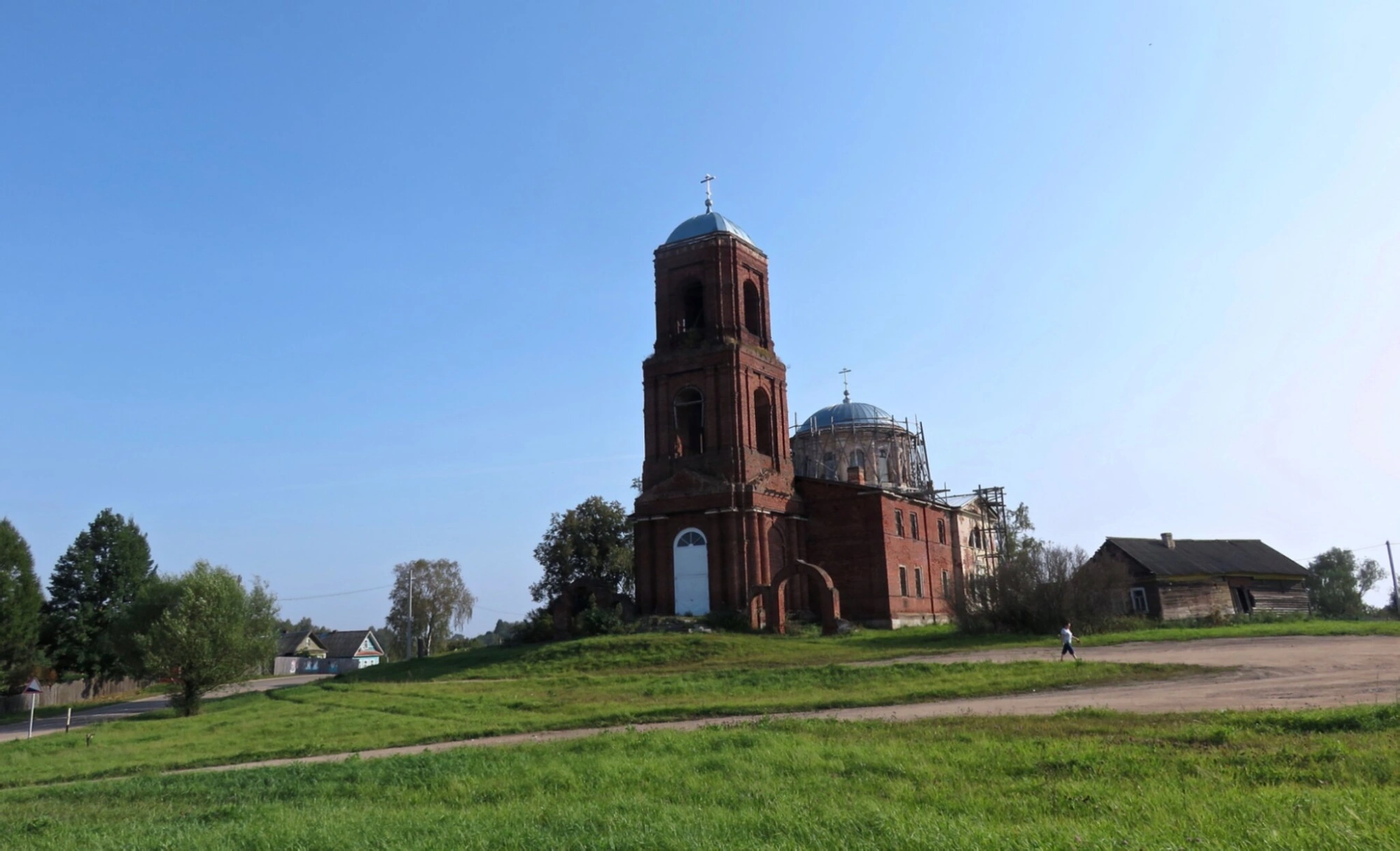 Храм расположен на живописном возвышении, что подчёркивает его величие и доминирующее положение в сельском пейзаже. Окружённый зелёными лугами и деревенскими постройками, он создаёт гармоничный образ русского православного ландшафта. На переднем плане фотографии видна грунтовая дорога, а на заднем — ясное небо и силуэты деревьев, что придаёт снимку особую глубину и атмосферность.