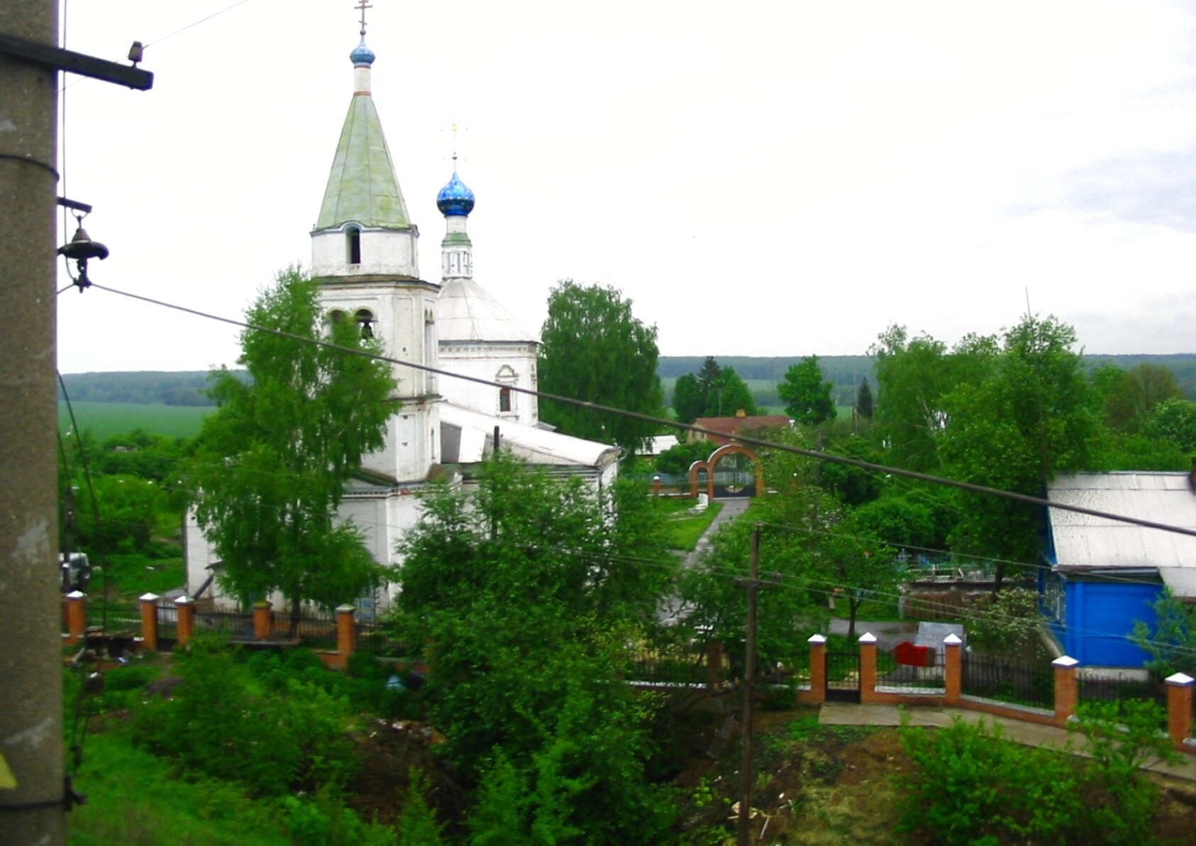 Храм органично вписан в окружающий сельский пейзаж. Его окружают высокие раскидистые деревья, которые словно хранят благодатную тишину и умиротворение этого святого места. К главному входу ведёт грунтовая дорога, а справа от храма виден фрагмент жилого строения. Присутствие столба с электропроводами на переднем плане указывает на обжитую местность, где современная жизнь гармонично соседствует с вековыми православными традициями.