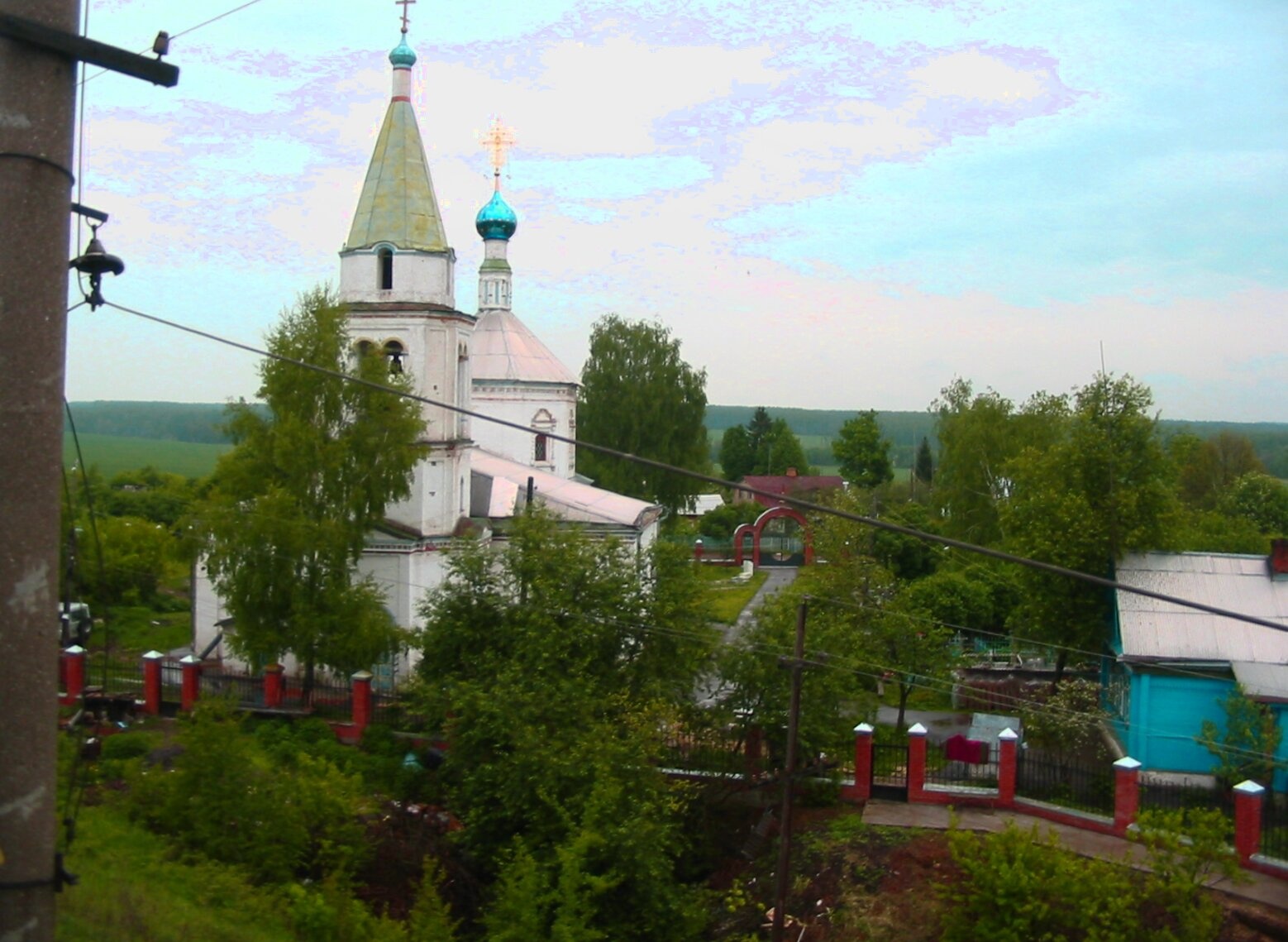 На переднем плане фотографии виднеются элементы сельской инфраструктуры — деревянные столбы и линии электропередач, что подчёркивает гармоничное сочетание современности и древних традиций. Храм окружает уютный сельский пейзаж: зелёные деревья, типичные для средней полосы России, и скромные деревенские постройки, создающие атмосферу покоя и умиротворения.