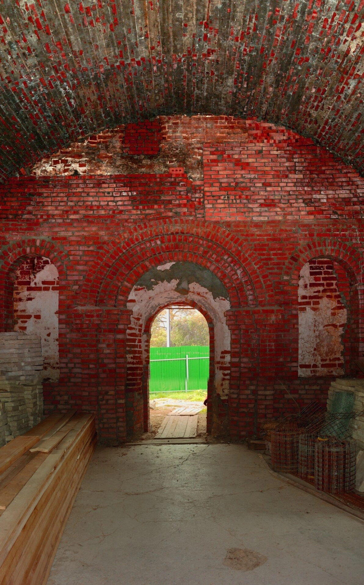 Состояние интерьера свидетельствует о проводимых восстановительных работах. На полу видны строительные материалы — деревянные доски и металлические сетки, необходимые для реставрации. Через центральный арочный проём просматривается зелёное ограждение, указывающее на активную фазу восстановления храмовой территории. Эти работы стали возможны после возвращения храма Русской Православной Церкви в 1999 году и создания православного прихода.