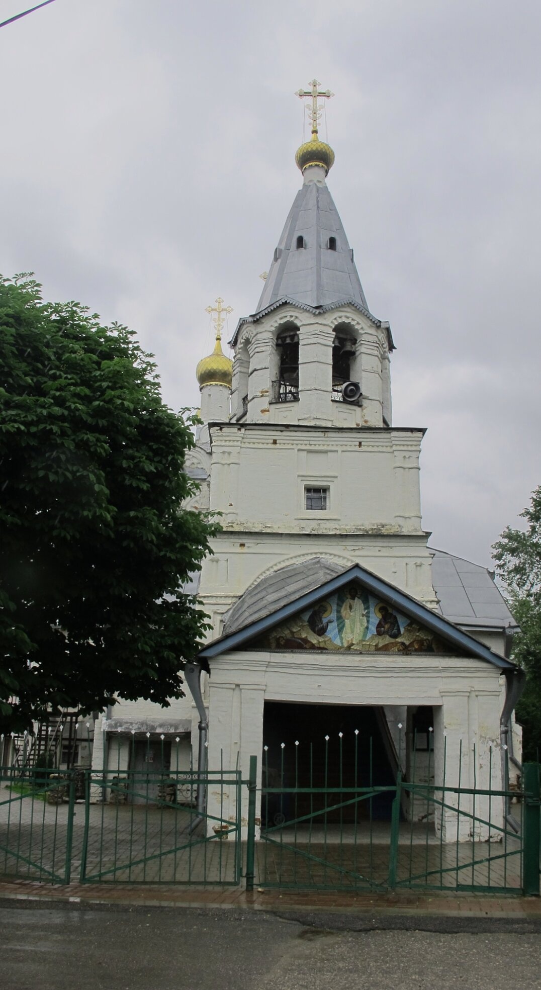 Над главным входом в дом Божий размещена фреска, изображающая святой образ, который благословляет входящих под священные своды храма. Территория вокруг церкви благоустроена, перед фасадом установлен зелёный металлический забор. С левой стороны кадра видно могучее раскидистое дерево, своей зеленью подчёркивающее благолепие рукотворного чуда.