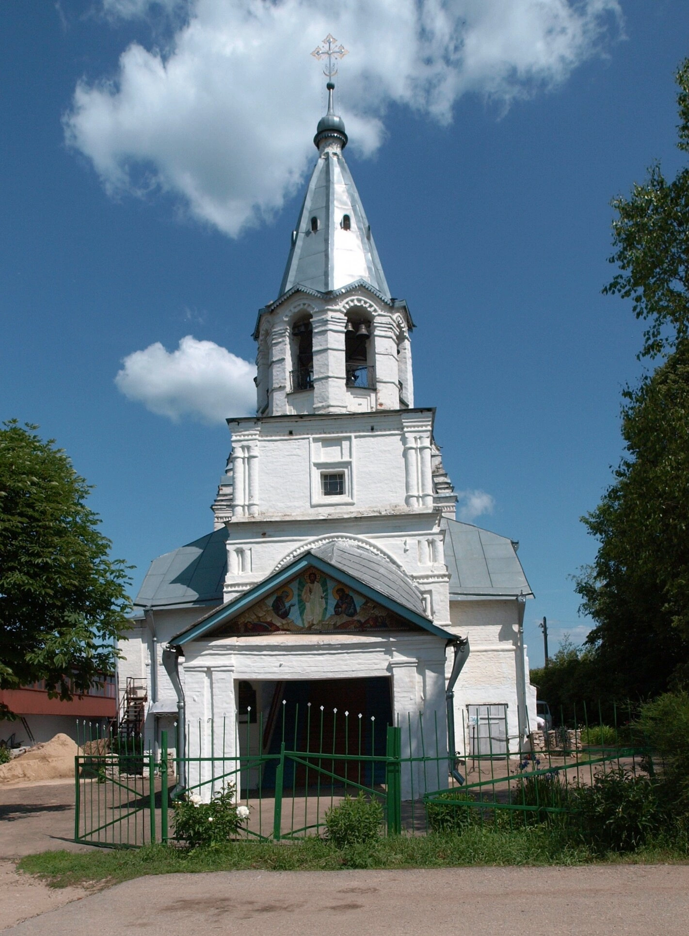 Территория вокруг церкви благоустроена и ограждена ажурным металлическим забором зелёного цвета. В день съёмки храм предстаёт в лучах ясного солнца под чистым голубым небом с кучевыми облаками, что подчёркивает благодатную атмосферу этого святого места. Светотень выгодно выделяет детали белокаменной кладки и архитектурное убранство.