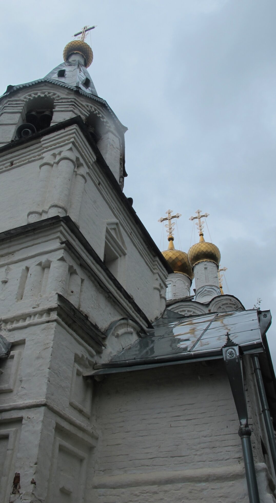 Белоснежные стены храма, контрастирующие с лазурным цветом кровли и карнизов, а также пасмурное небо на заднем плане придают фотографии особую атмосферность и величие. Часть листвы дерева в левой части кадра мягко обрамляет святыню, не скрывая её красоты. Церковь Преображения Господня в Спасе-Загорье является выдающимся памятником церковной архитектуры и духовным центром, привлекающим паломников и ценителей православного искусства.