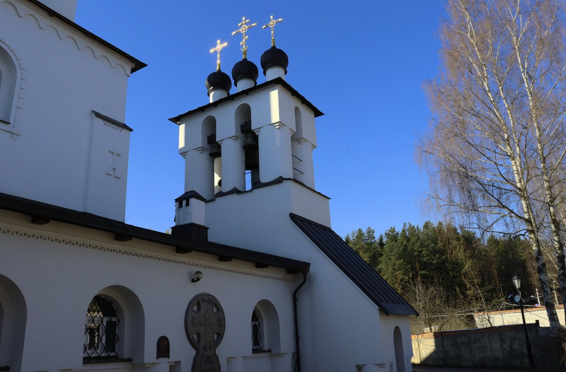 Белоснежные стены храма, символизирующие чистоту и святость, ярко сияют под небом, а тёмные купола-луковки, увенчанные золочёными православными крестами, устремляются к небесам. Композиция снимка позволяет оценить гармоничные пропорции и стройность архитектурного решения, характерного для традиционного церковного зодчества.