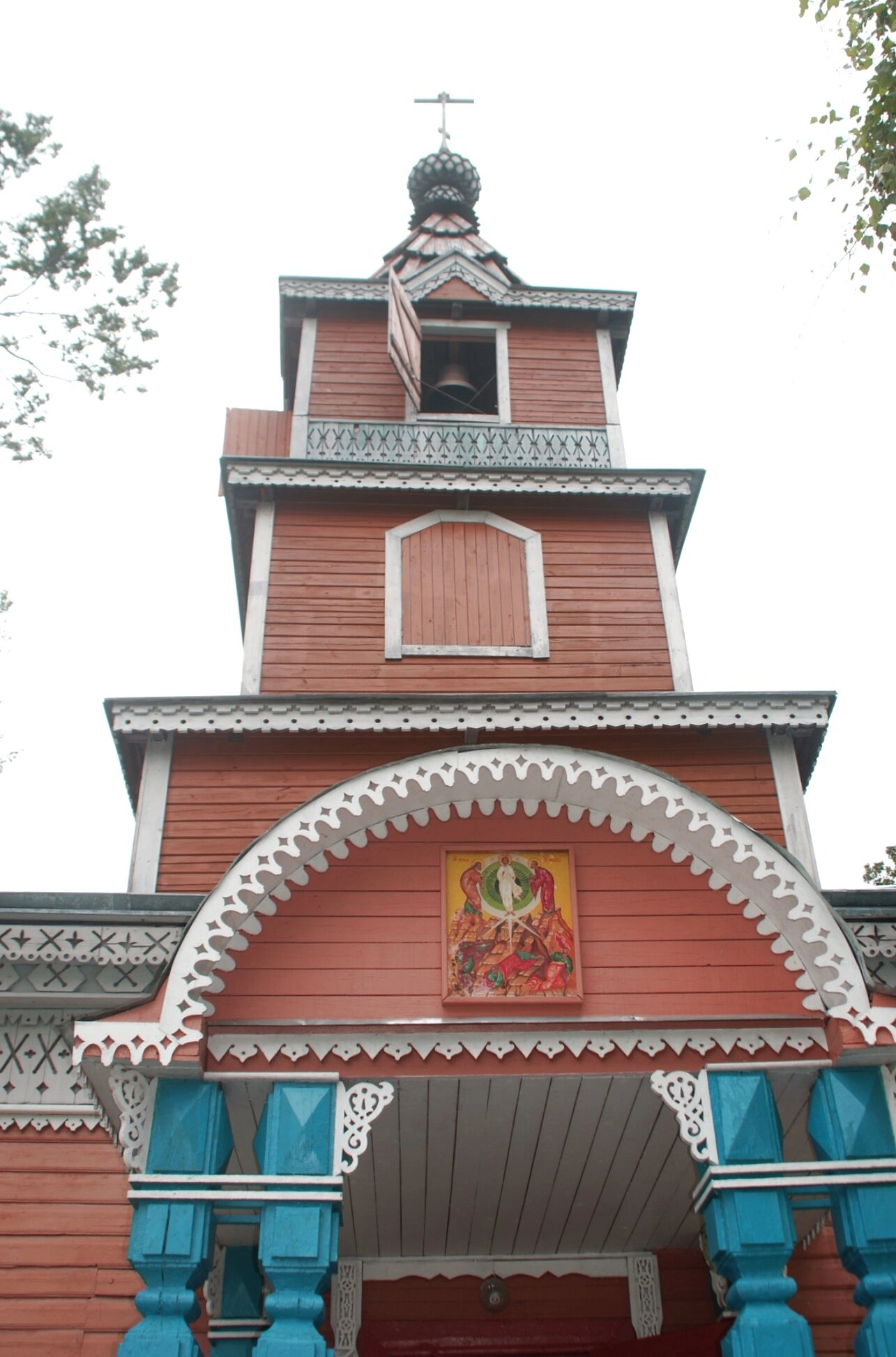 Над входом в храм располагается священный образ, что является традиционным элементом православной церковной архитектуры. Двухъярусная колокольня увенчана луковичной главкой, на которой возвышается православный крест, символизирующий искупительную жертву Христа. На колокольне хорошо просматривается открытое окно, откуда разносятся благозвучные звоны, призывающие верующих к молитве.