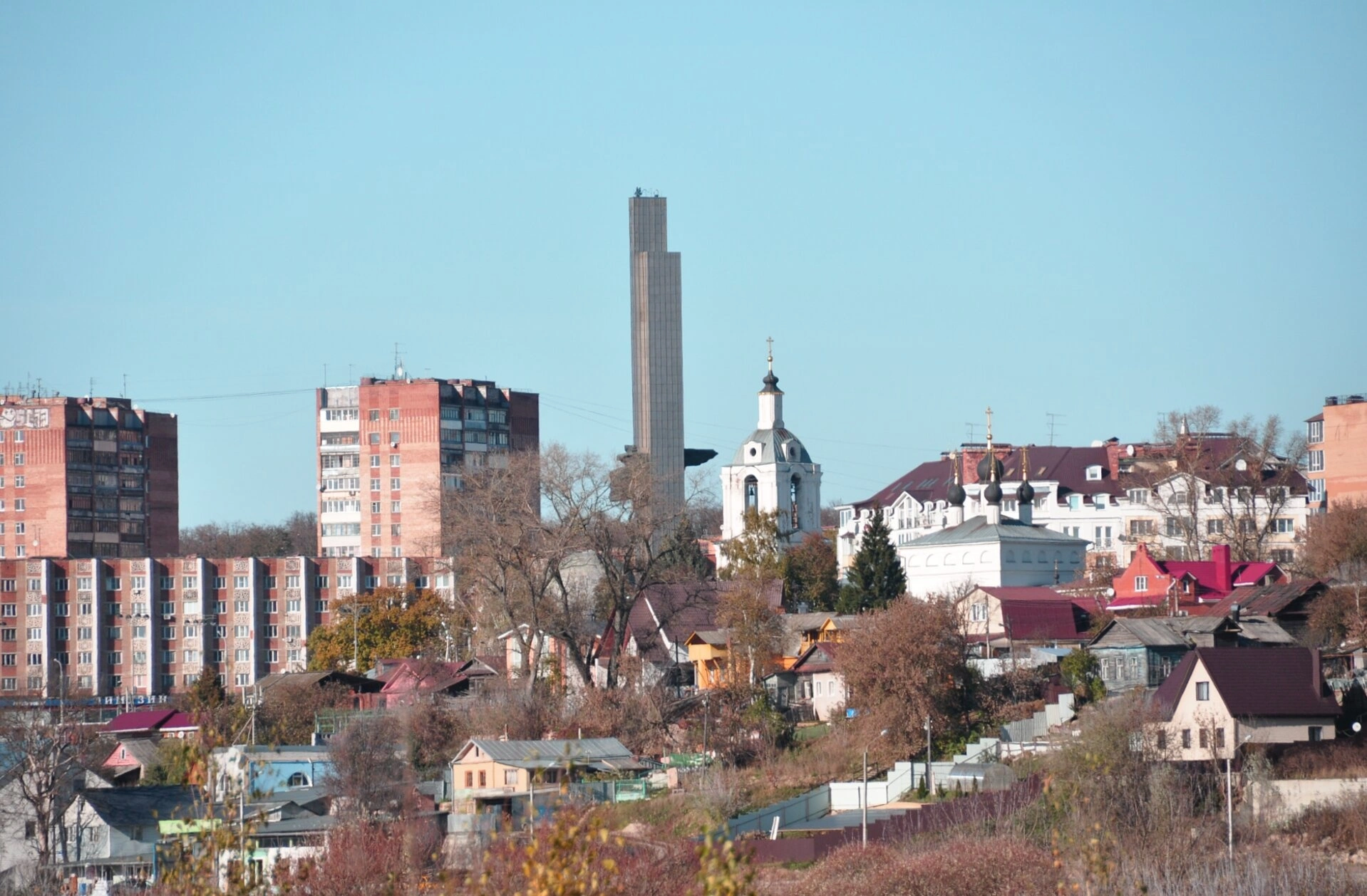 На представленной фотографии запечатлён величественный православный храм в честь Преображения Господня, известный в Калуге как церковь «за Верхом». Снимок выполнен с высокого берега реки Яченки, открывая вид на один из красивейших храмовых ансамблей города.