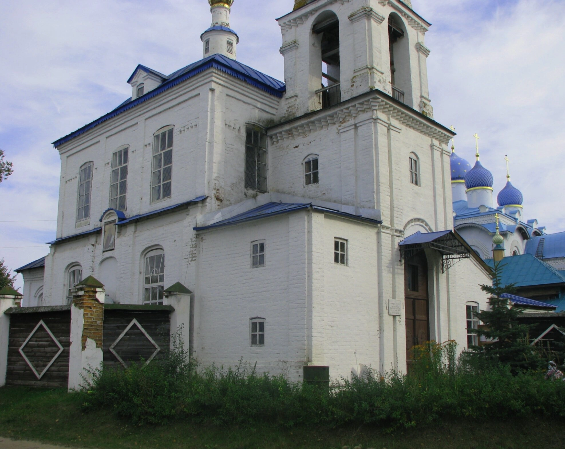Белоснежный храм, сияющий на фоне окружающей зелени, представляет собой прекрасный образец русского церковного зодчества. Его светлые стены из кирпича символизируют чистоту и духовную благодать. Архитектурный ансамбль включает основную часть, трапезную и многоярусную колокольню, увенчанную шпилем. Особую торжественность и небесную символику храму придают синие купола и кровля, традиционные для православного храмостроительства.