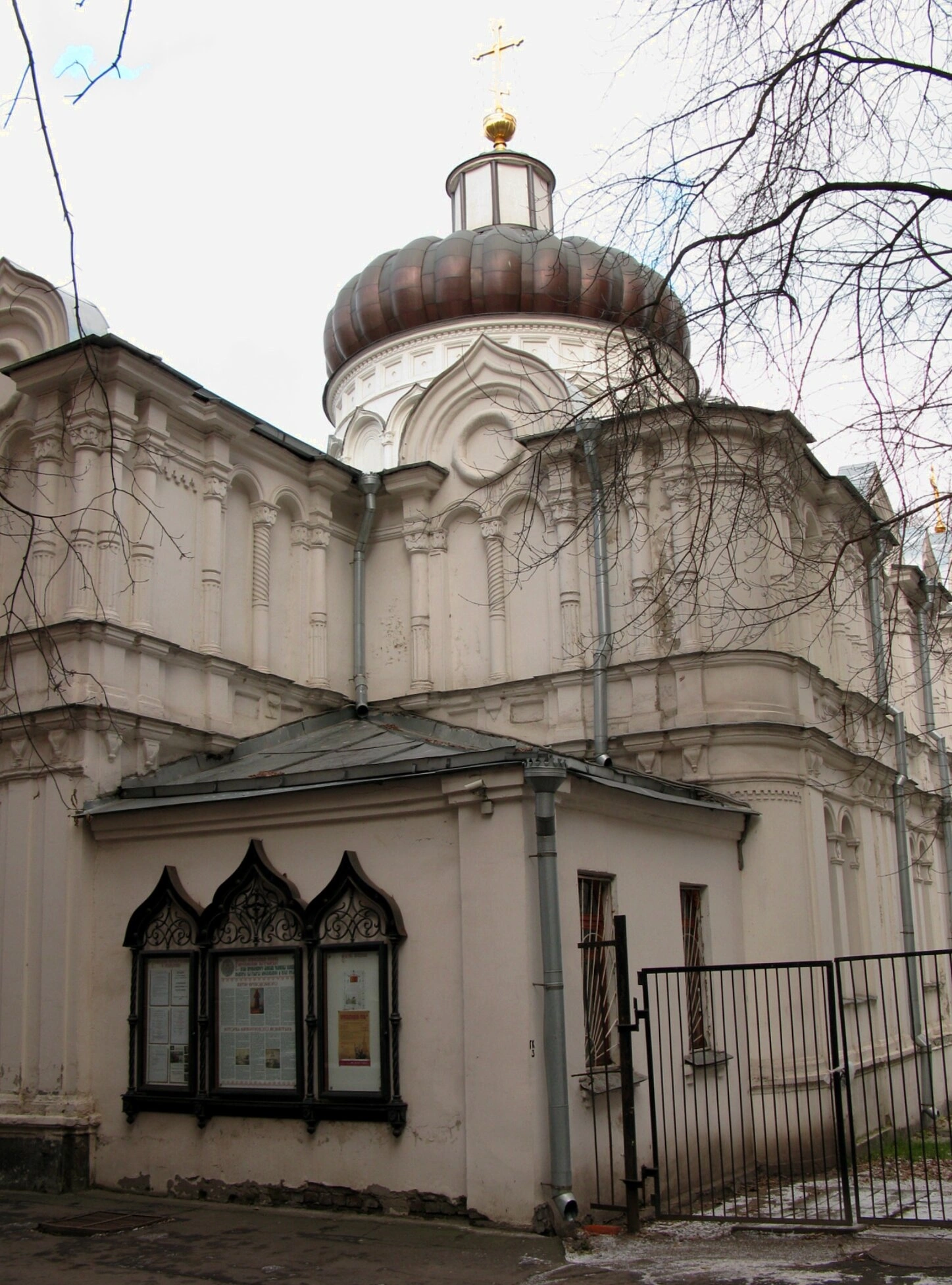 Святыня, которую мы видим на снимке, была возведена в 1853 году по проекту выдающегося московского зодчего Михаила Доримедонтовича Быковского. Архитектурный облик храма, выдержанный в традициях древнерусского зодчества, являет собой образец высокого мастерства и благоговейного отношения к сакральному искусству. Основной объём, вытянутый с востока на запад, венчает величественный купол, водружённый на широком световом барабане. Фасады украшены декором, напоминающим об узорочье XVII века, а завершаются они изящными килевидными аттиками.
