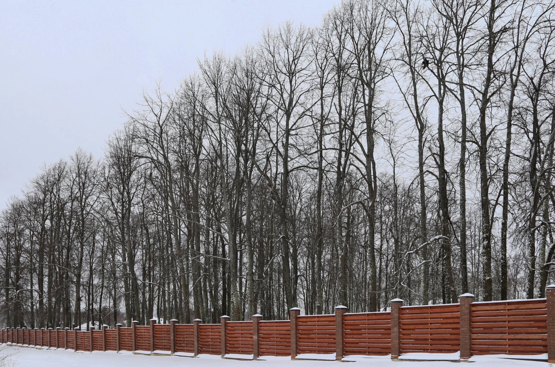 На переднем плане изображен протяженный деревянный забор, состоящий из горизонтальных планок и кирпичных опорных столбов, который отделяет основную территорию от прилегающей лесной зоны. За ограждением виднеются голые ветви деревьев, покрытые инеем, создающие ощущение умиротворенного покоя, характерного для зимней поры в русской провинции.
