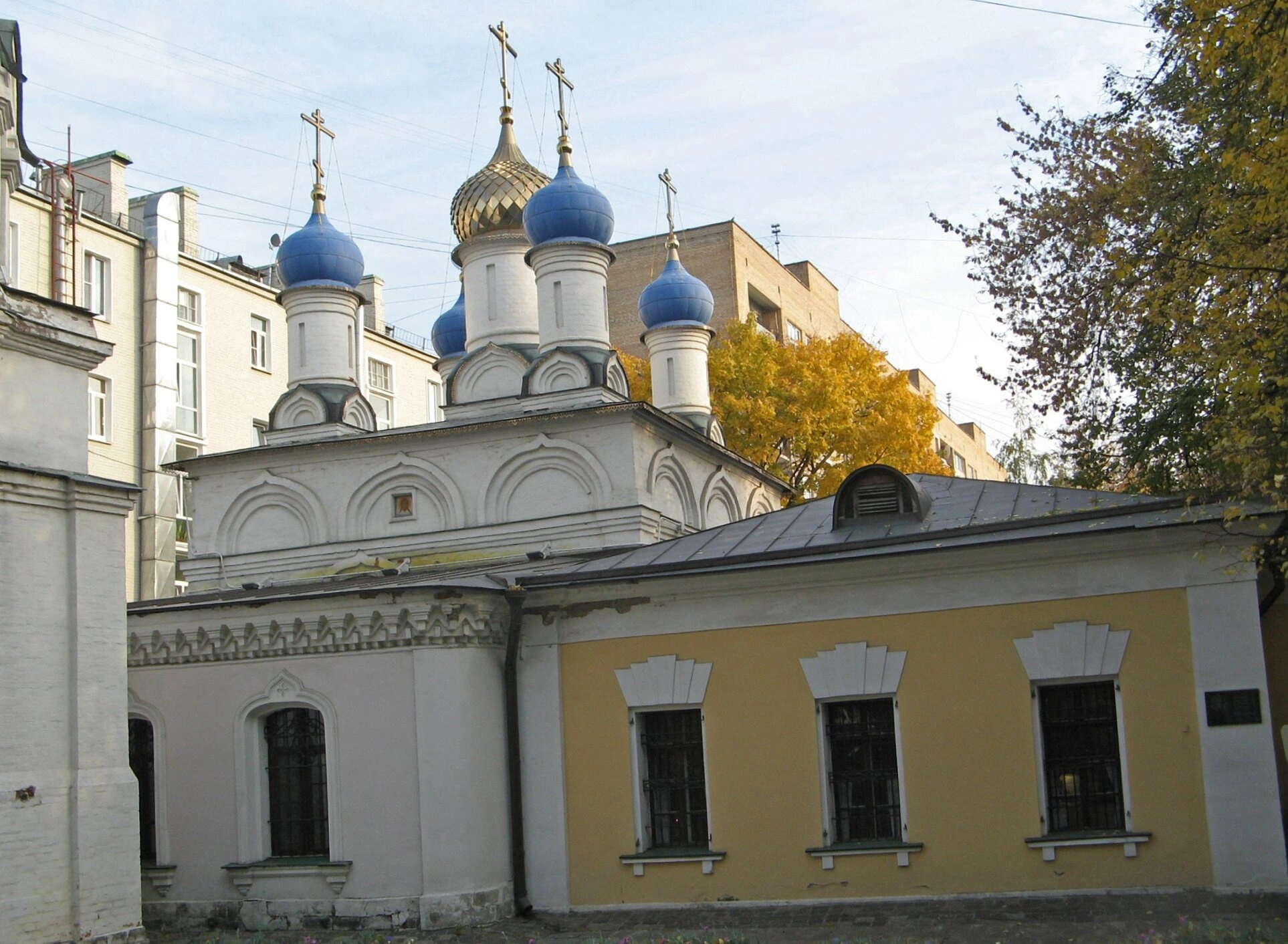 На представленной фотографии запечатлён старинный московский храм во имя Преподобного Феодора Студита, что у Никитских ворот. Этот православный храм, освящённый в честь великого византийского подвижника и церковного деятеля, является одной из духовных жемчужин столицы и обладает богатой историей, неразрывно связанной с судьбой первого русского царя из династии Романовых.