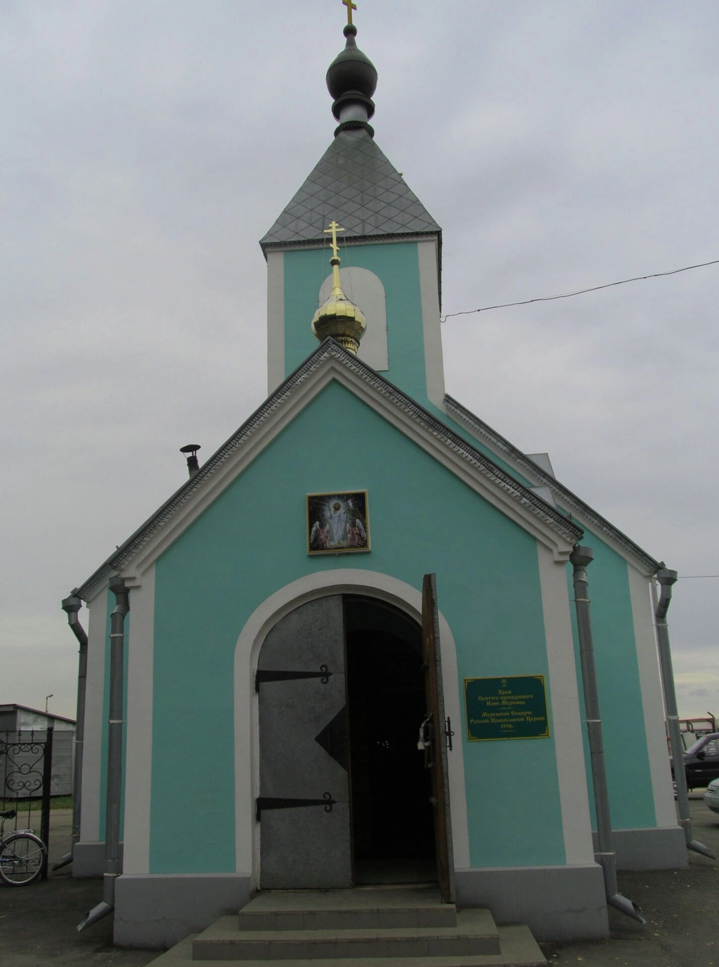 Над основным скатом крыши возвышается шатёр с чёрным куполом, который увенчан золочёным крестом. Над арочным окном фронтона расположен меньший золотой купол также с крестом. Над входом, в неглубокой нише, помещена небольшая икона. Справа от двери видна зелёная информационная табличка. Слева от храма просматривается металлический забор и припаркованный велосипед, справа — часть автомобиля. Небо в момент съёмки затянуто серыми облаками, что придаёт снимку сдержанное, сосредоточенное настроение.
