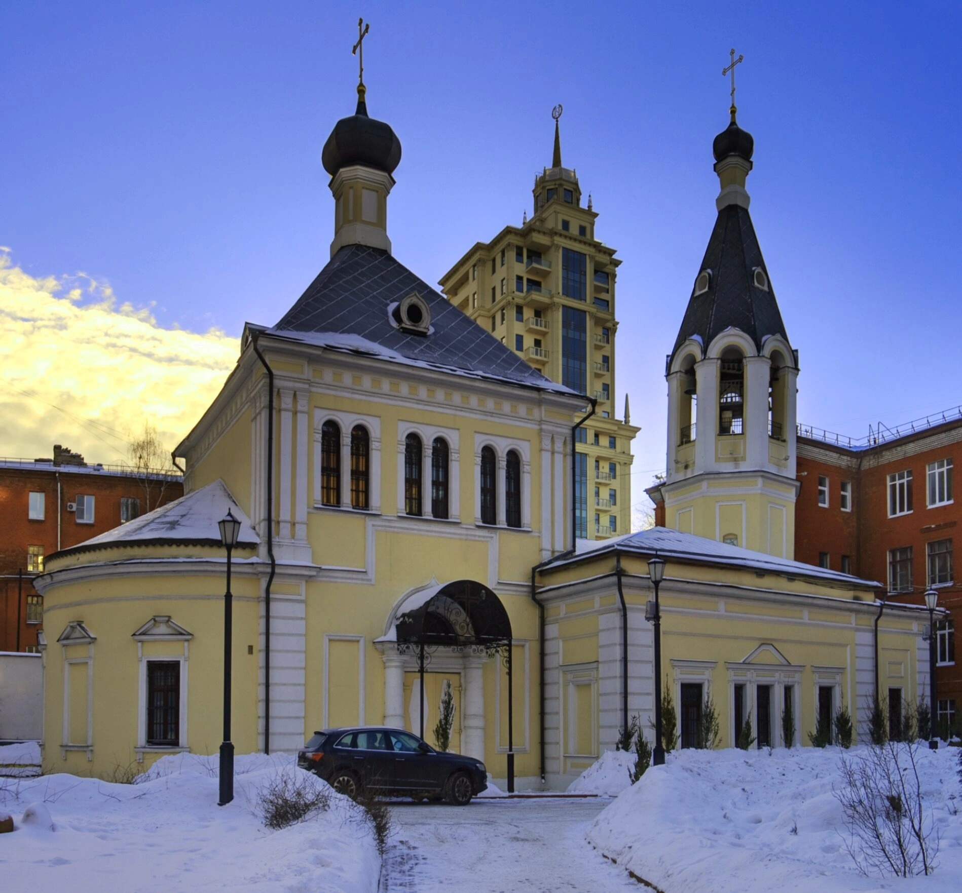 На фотографии отсутствуют люди, что позволяет в полной мере сосредоточить внимание на архитектурных достоинствах храма и его духовном значении. Припаркованный автомобиль на переднем плане свидетельствует о современном контексте существования древней святыни в мегаполисе.