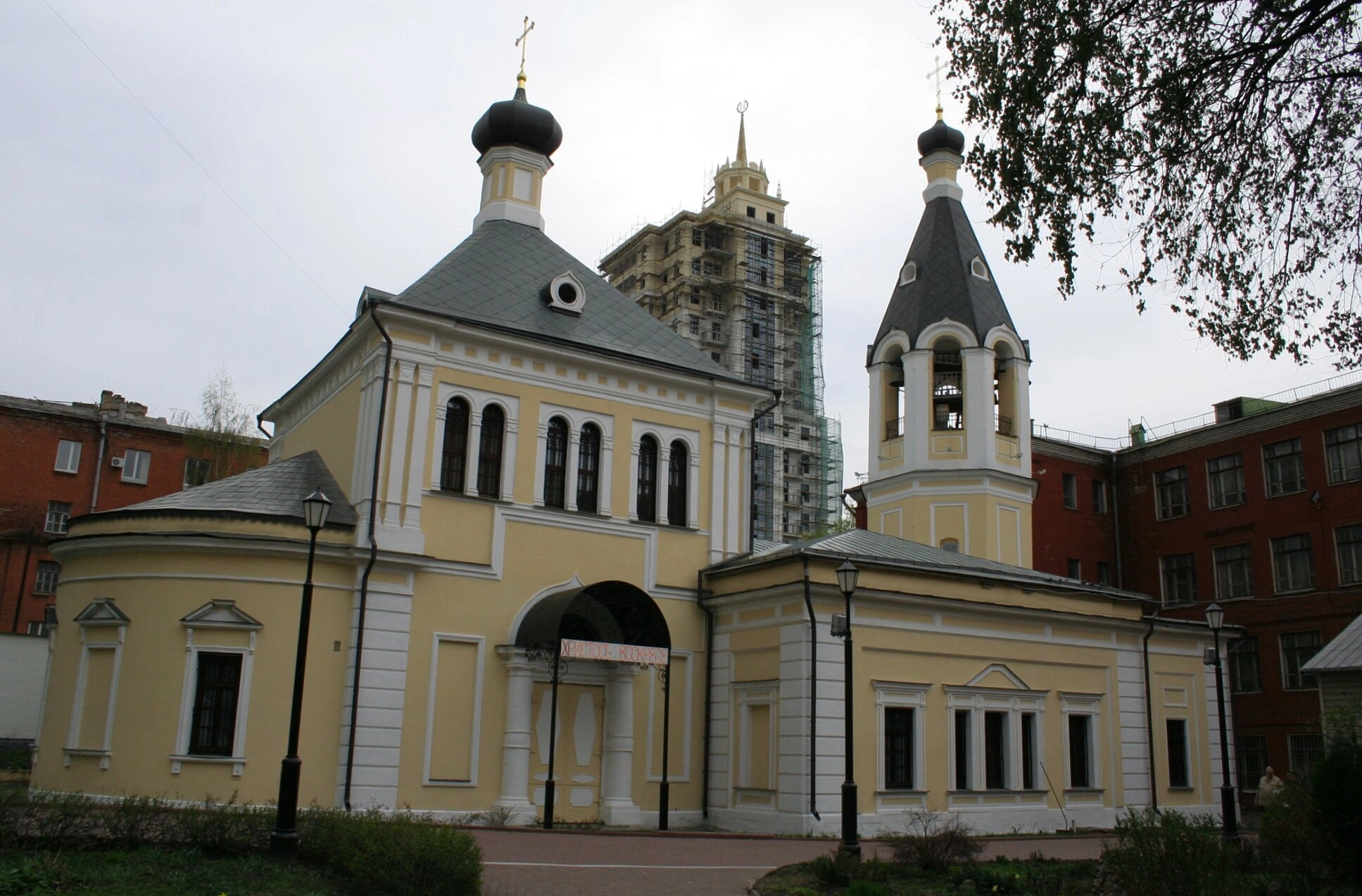 На фотографии запечатлён храм преподобного Марона Пустынника Сирийского, расположенный в историческом районе Москвы Старые Панехи по адресу: улица Большая Якиманка, дом 32, строение 2. Этот православный храм является уникальным памятником церковной архитектуры и духовной жизни столицы.