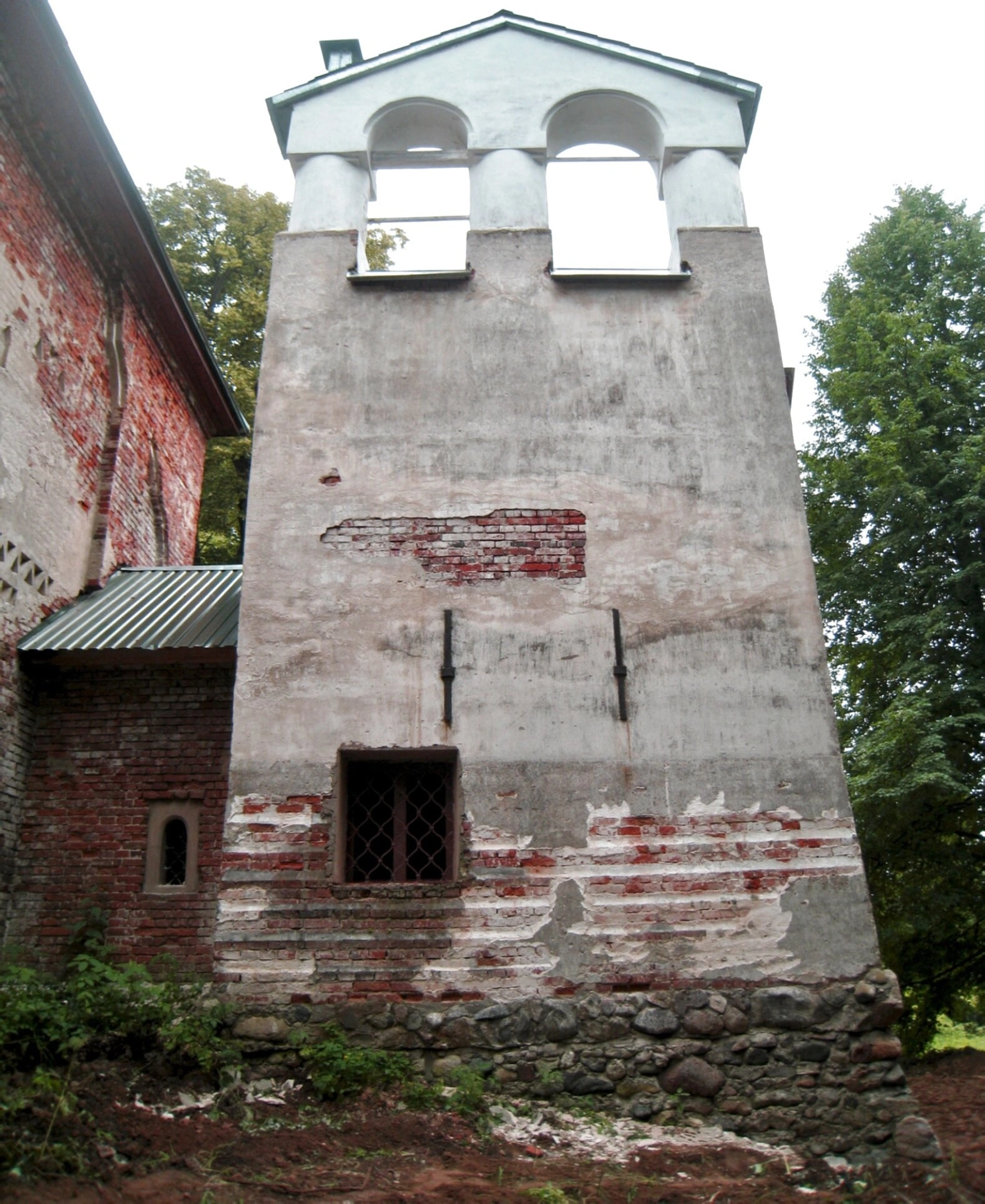 Фотография позволяет детально рассмотреть характерные архитектурные элементы. Основание сооружения сложено из грубого, неотёсанного камня, что придаёт ему ощущение древности и основательности. Стены основной части колокольни покрыты побелкой или старой штукатуркой сероватого оттенка, на которой видны следы времени в виде осыпавшихся участков, обнаживших кирпичную кладку. В нижнем ярусе находится небольшое квадратное окно, защищённое металлической решёткой.
