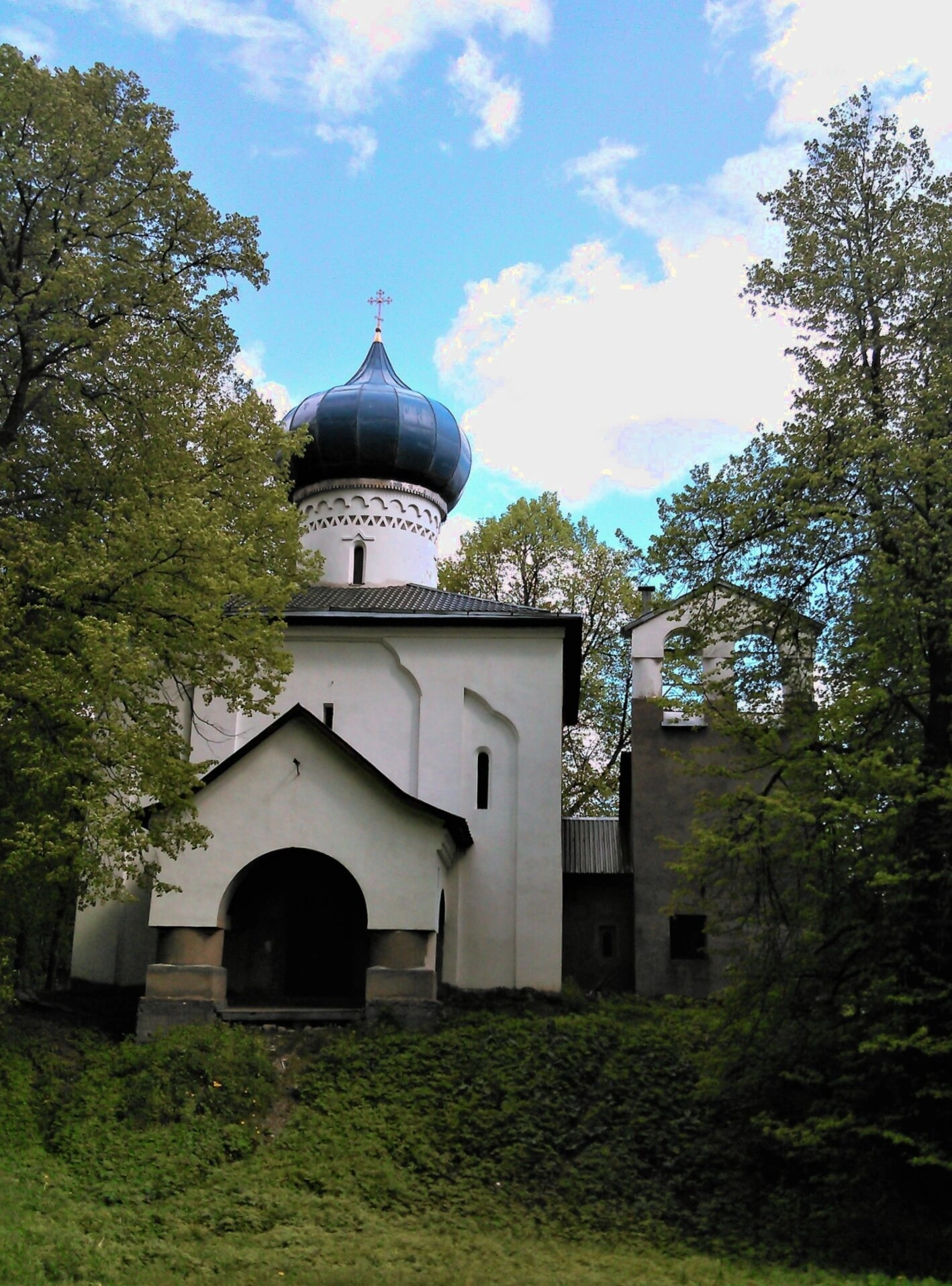 Храм гармонично вписан в природный ландшафт. Он окружён вековыми деревьями с пышной кроной, что создаёт ощущение уединённости, молитвенной тишины и благоговения. Перед зданием простирается ухоженный участок, покрытый изумрудной травой. Фотография сделана в ясный солнечный день: мягкий свет подчёркивает белизну стен и фактуру камня, а купол отчётливо выделяется на фоне голубого неба с кучевыми облаками.