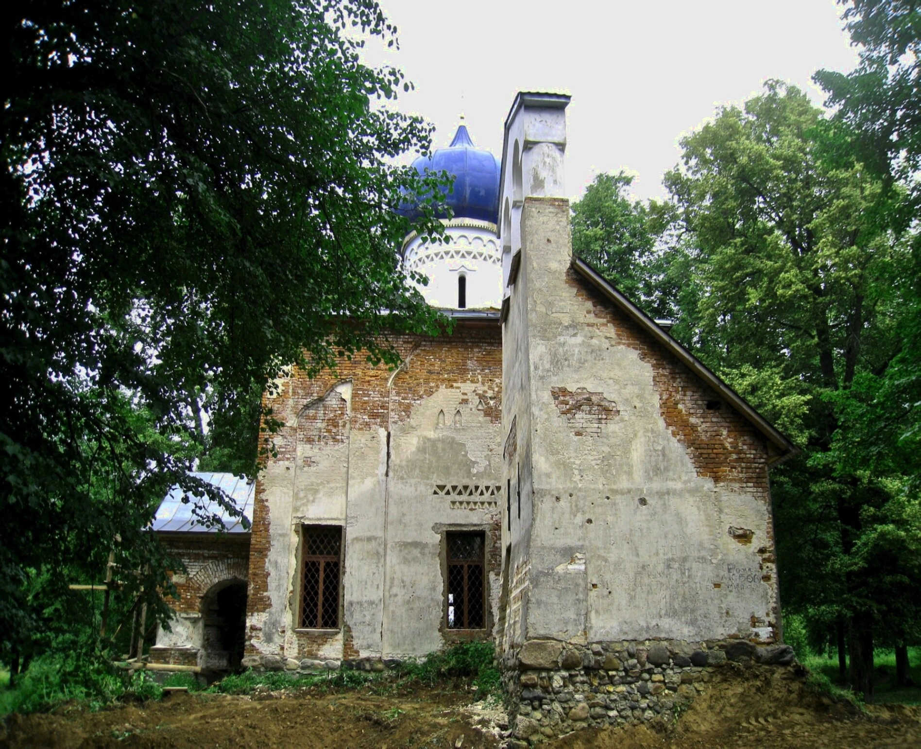 Храм гармонично вписан в окружающий природный ландшафт. Густые деревья, окружающие церковь, создают атмосферу уединённости и молитвенного покоя, подчёркивая духовное значение этого места. Синий цвет купола, символизирующий небесную чистоту и Пресвятую Богородицу, ярко выделяется на фоне зелени и неба.