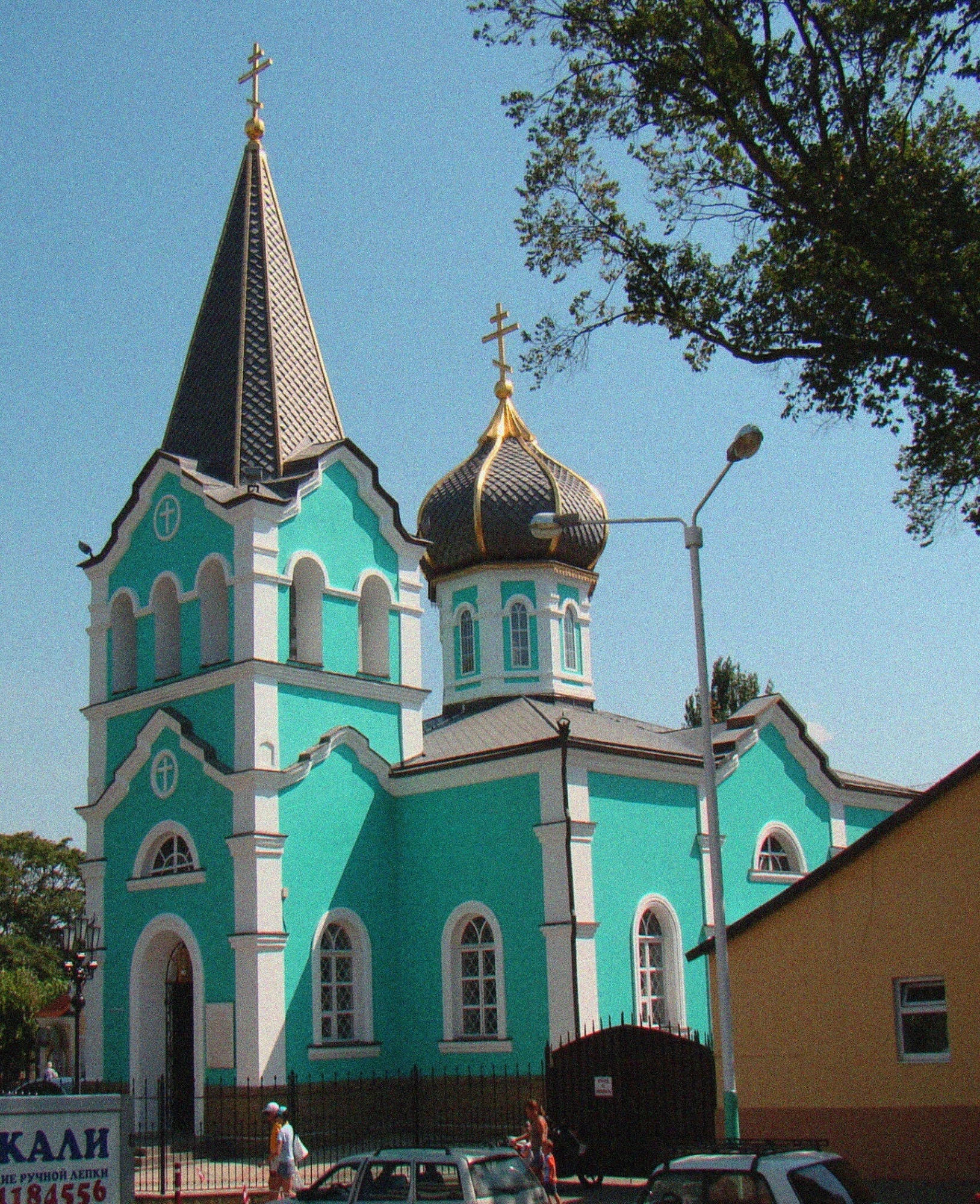 Архитектурный облик храма исполнен в традициях русского церковного зодчества. Здание окрашено в умиротворяющий бирюзовый цвет, который гармонично сочетается с белоснежными декоративными элементами и деталями, создавая яркий и праздничный образ. Главным украшением являются злаченые купола, увенчанные православными крестами, которые сияют под южным солнцем. Высокий шпиль колокольни устремлён в небо, символизируя молитвенное предстояние.