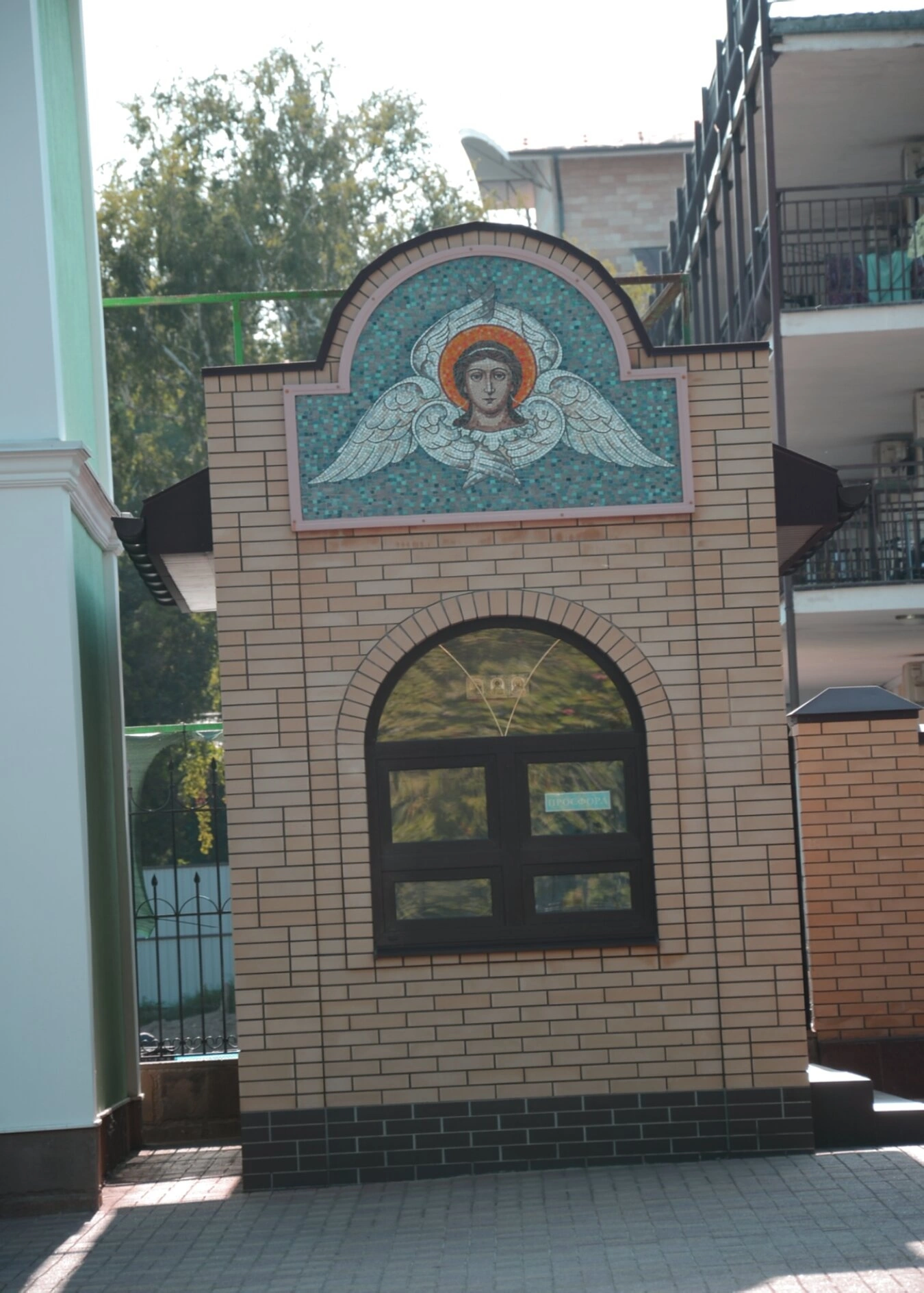 Справа от оконного проема взору открывается великолепное мозаичное панно, изображающее небесного серафима. Святой ангел предстаёт с распростёртыми крылами, символизирующими готовность к служению Господу. Его лик окружён сияющим нимбом, а весь образ выполнен в смиренной и возвышенной цветовой гамме, где преобладают лазурно-синие, белые и золотистые тона, традиционные для православной иконографии.