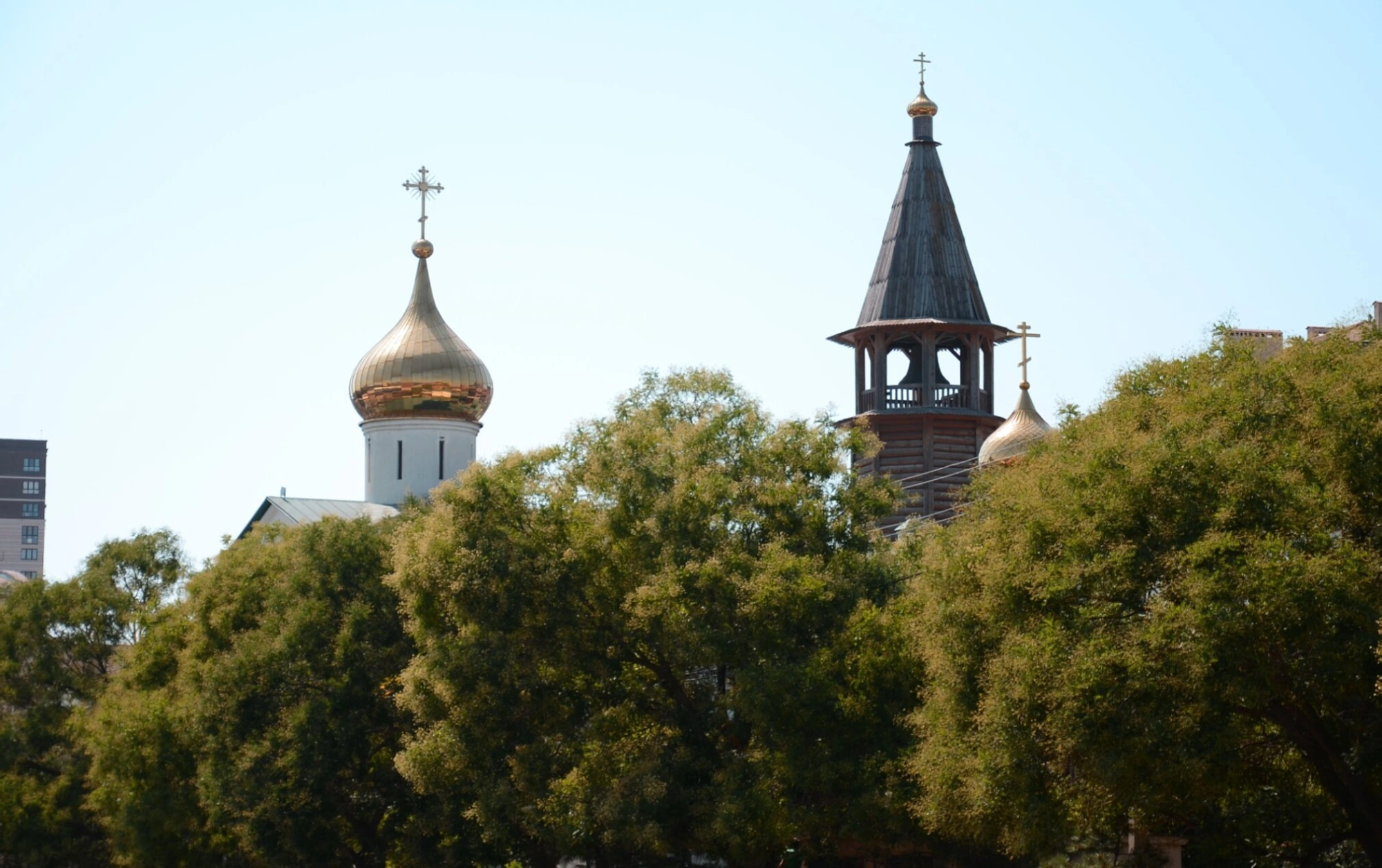 В центре композиции возвышается деревянная шатровая колокольня, увенчанная православным крестом. Ее ажурная конструкция характерна для традиционного русского храмового зодчества. Слева от колокольни расположен основной объем храма, выполненный в белых тонах и украшенный золотым куполом, сияющим в лучах южного солнца. Справа от колокольни просматривается еще один золотой купол, вероятно, принадлежащий дополнительному приделу храма.