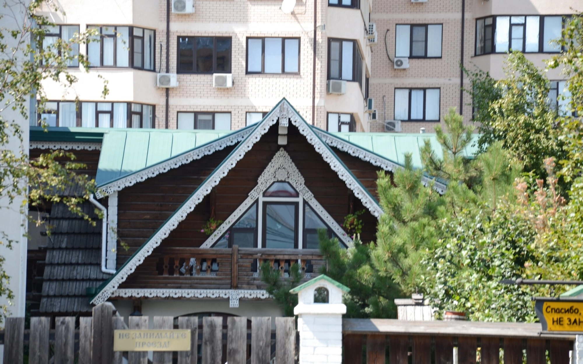 На снимке хорошо виден контраст между традиционной деревянной архитектурой храма и современным многоэтажным зданием на заднем плане, что символизирует непрерывность духовной традиции в условиях современного города. Храм служит местом молитвенного уединения и духовного окормления для жителей и гостей курортного города.