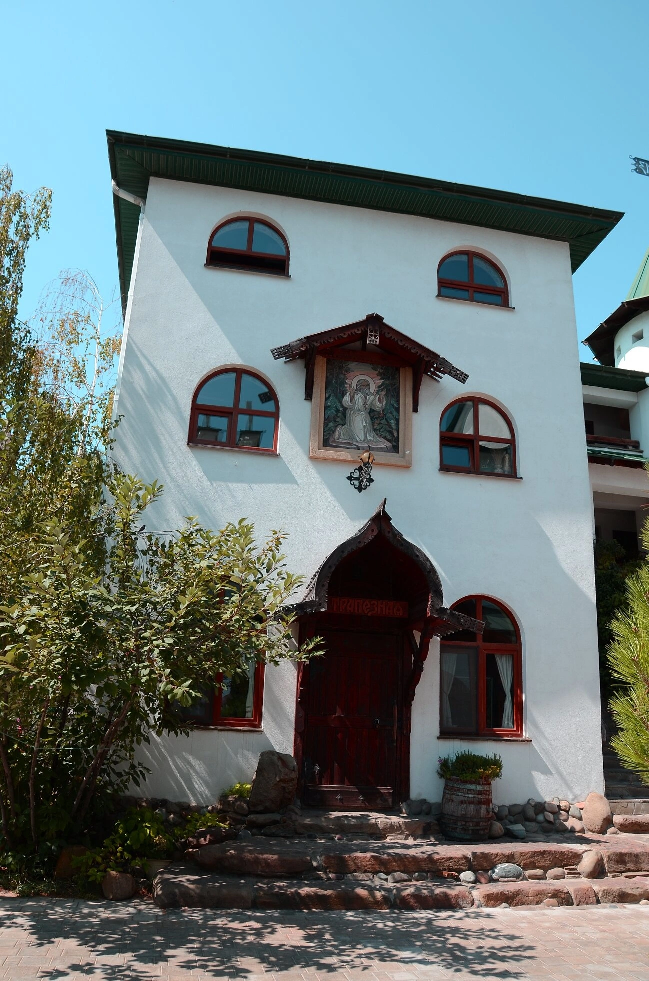 С левой стороны от входа расположена каменная лестница, ведущая к храму, а также элементы благоустройства территории, включая декоративные деревья и кустарники. Архитектурный ансамбль гармонично вписан в окружающий ландшафт, создавая атмосферу молитвенного уединения и покоя.