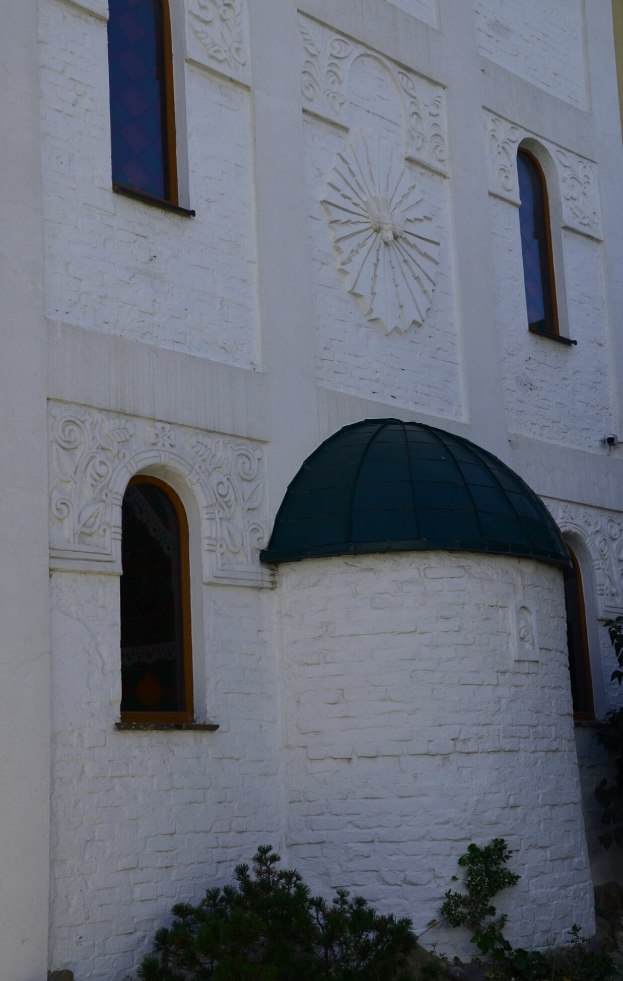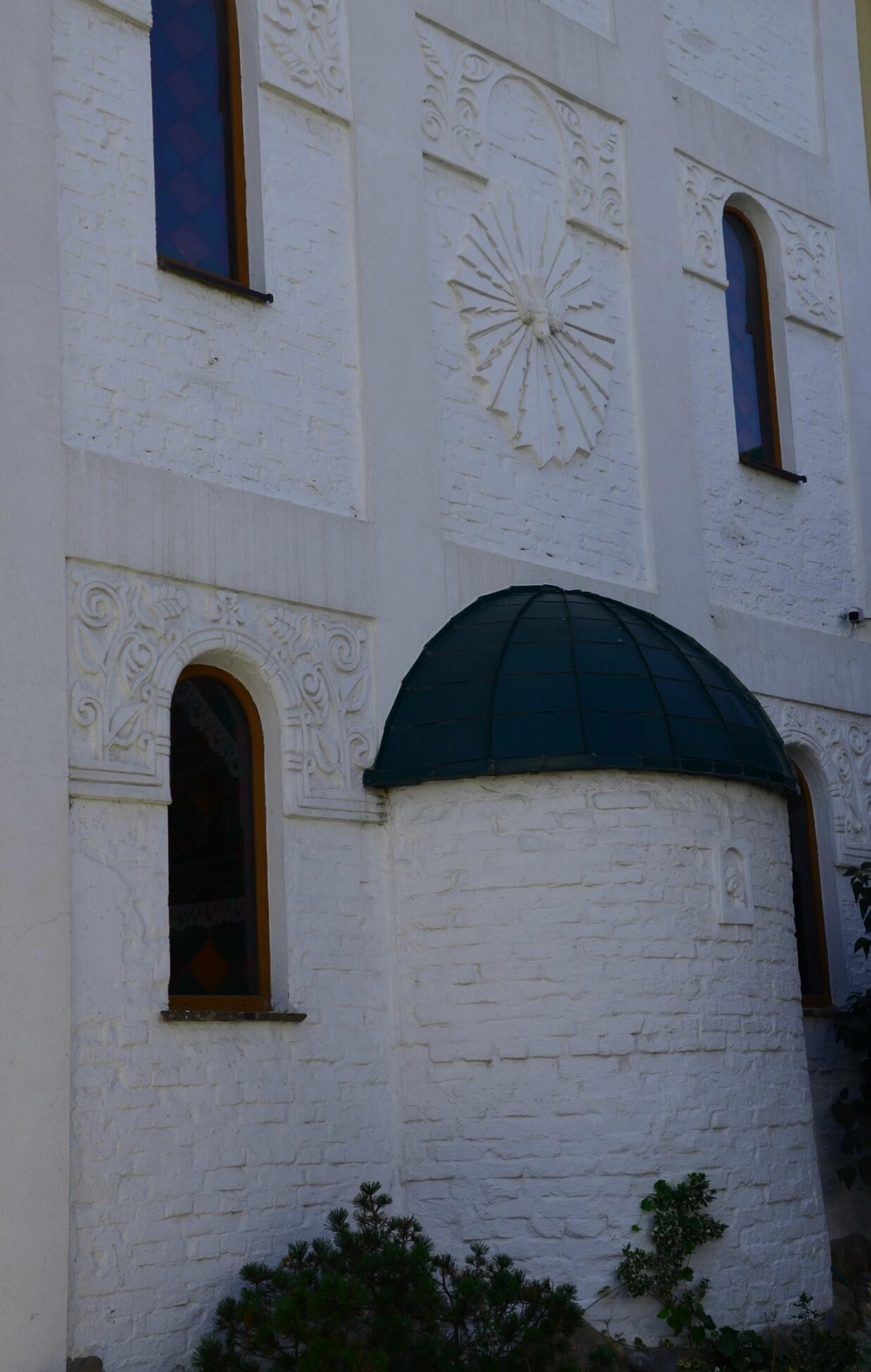 Особого внимания заслуживают декоративные элементы фасада. Архитектурная композиция украшена изящной лепниной с растительными орнаментами, а также декоративным элементом, напоминающим символическое изображение солнца — традиционный символ света веры в православной традиции.
