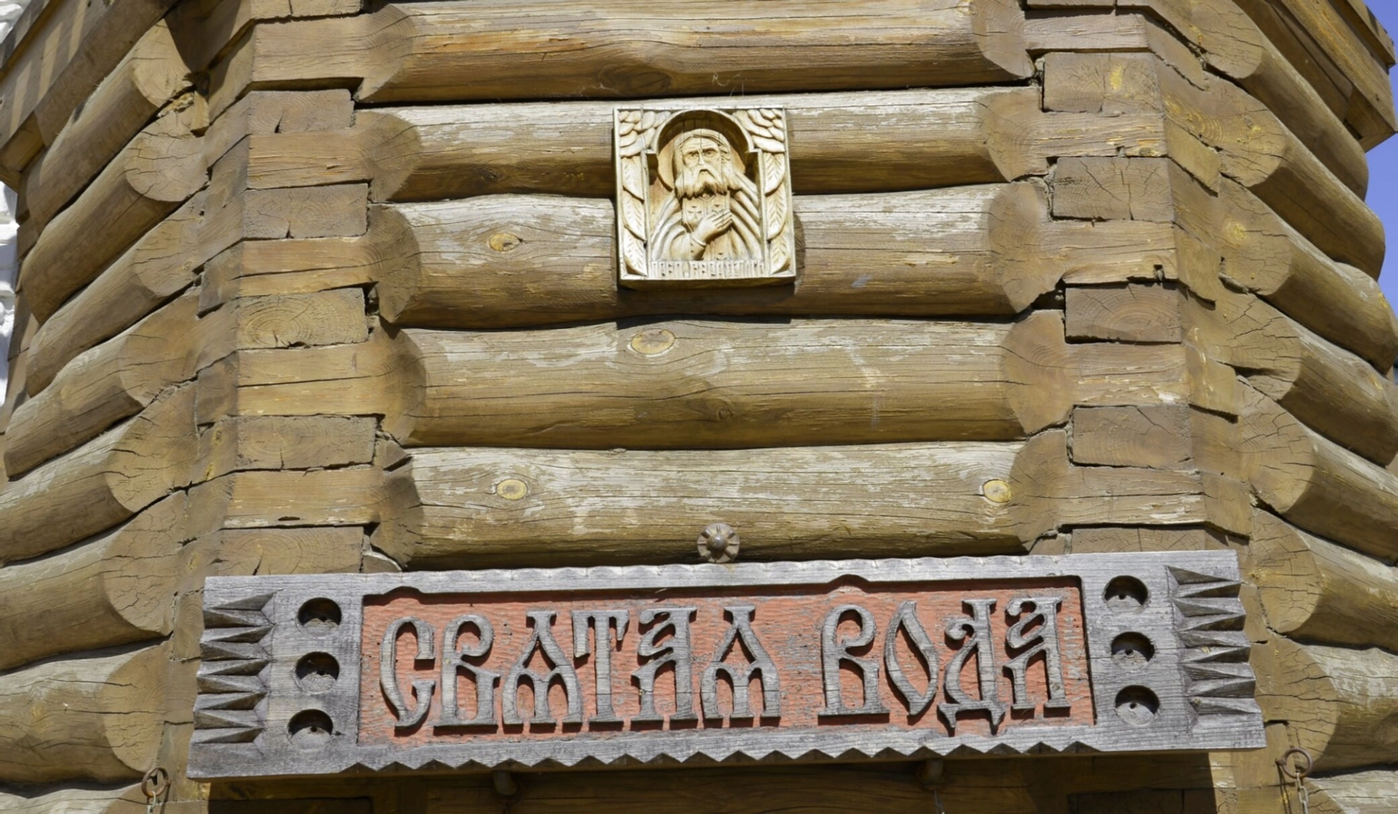 Под резной иконой расположена деревянная табличка красного цвета с вырезанной надписью «СВЯТАЯ РУСЬ», выполненной в старославянском стиле. Табличка украшена резным орнаментом и подвешена на декоративных цепях, что добавляет композиции торжественности. Храм преподобного Серафима Саровского в Анапе является значимым духовным центром и образцом современного деревянного храмостроительства, сохраняющим традиции русского православного зодчества.