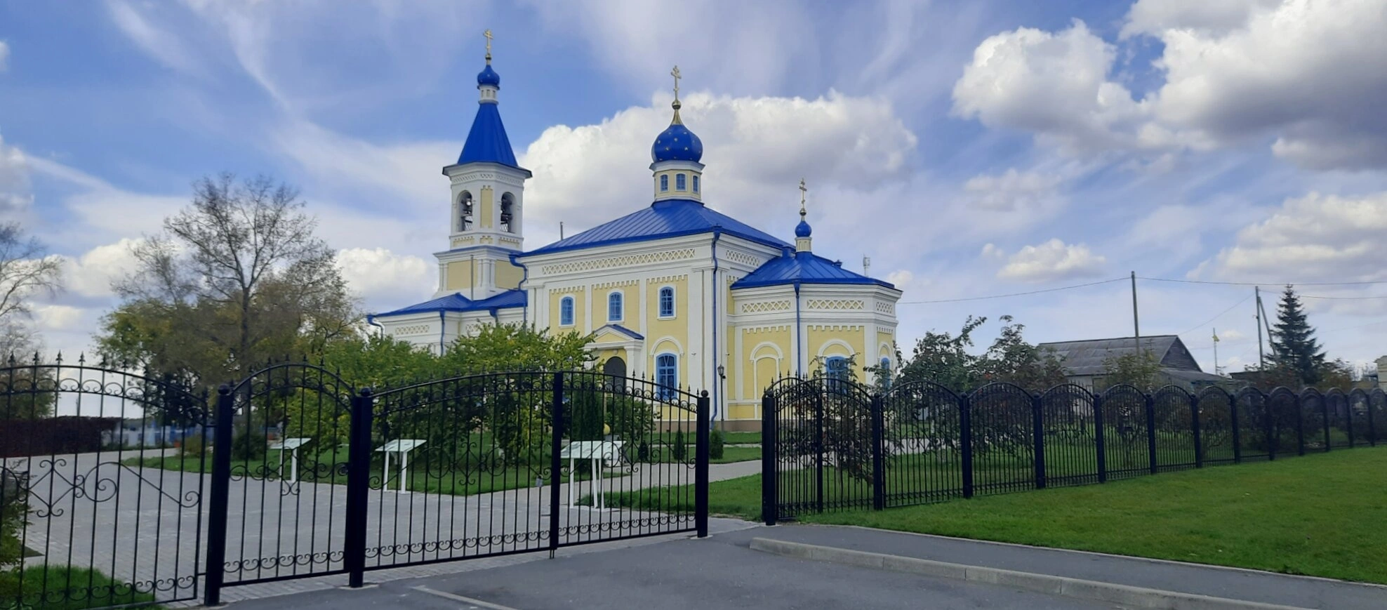 Территория вокруг церкви благоустроена и огорожена ажурным кованым забором с воротами. Зелёные насаждения и деревья создают атмосферу умиротворения. Рядом с каменным храмом видно скромное деревянное строение, что напоминает о простоте и смирении, которые проповедовал святой Саровский чудотворец.