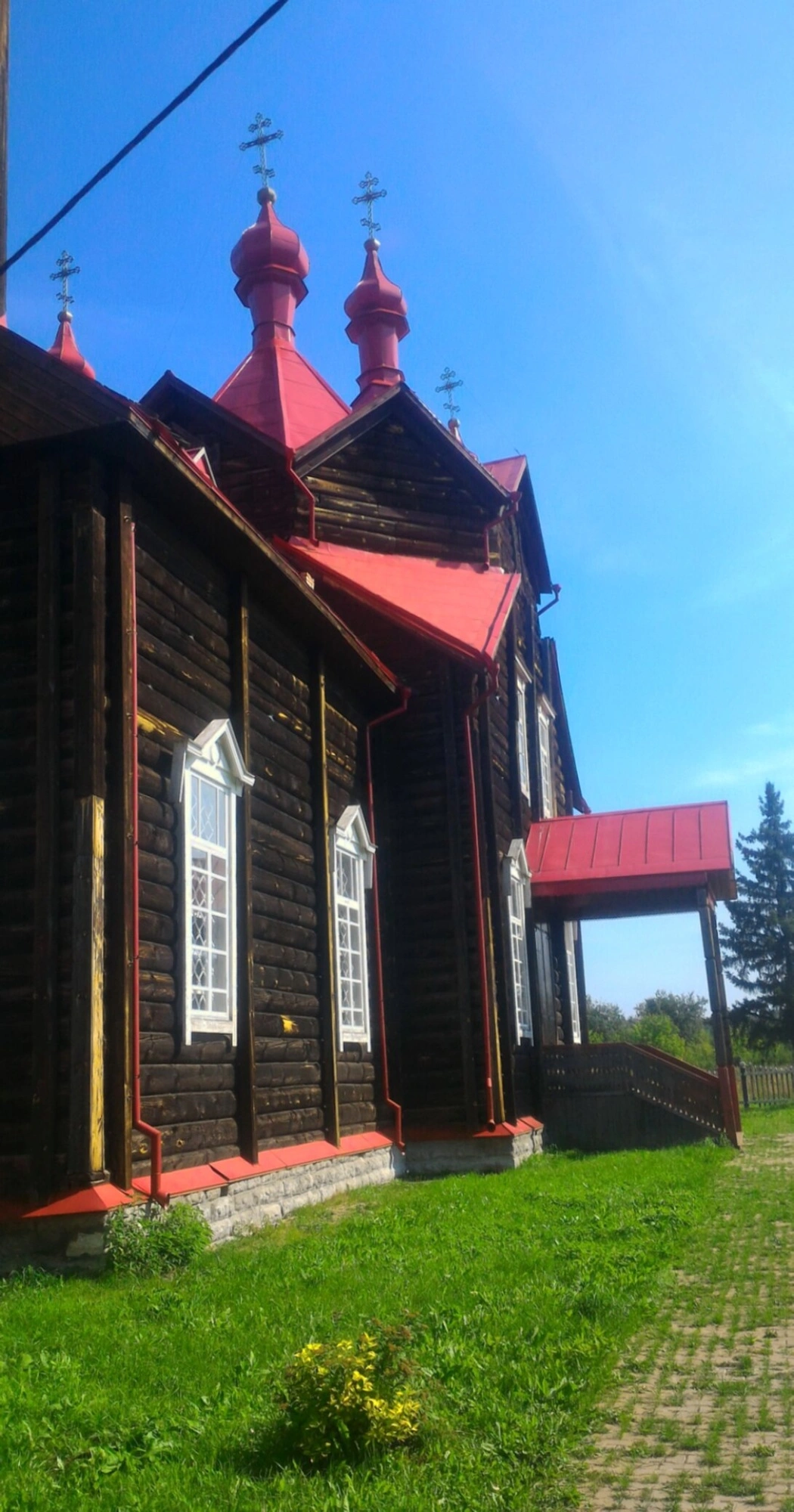 На представленной фотографии запечатлён деревянный православный храм во имя преподобного Серафима Саровского, расположенный в селе Турнаево Болотнинского района Новосибирской области. Этот уникальный храмовый комплекс является одной из немногих сохранившихся деревянных церквей начала XX века в Сибири и обладает статусом объекта культурного наследия.