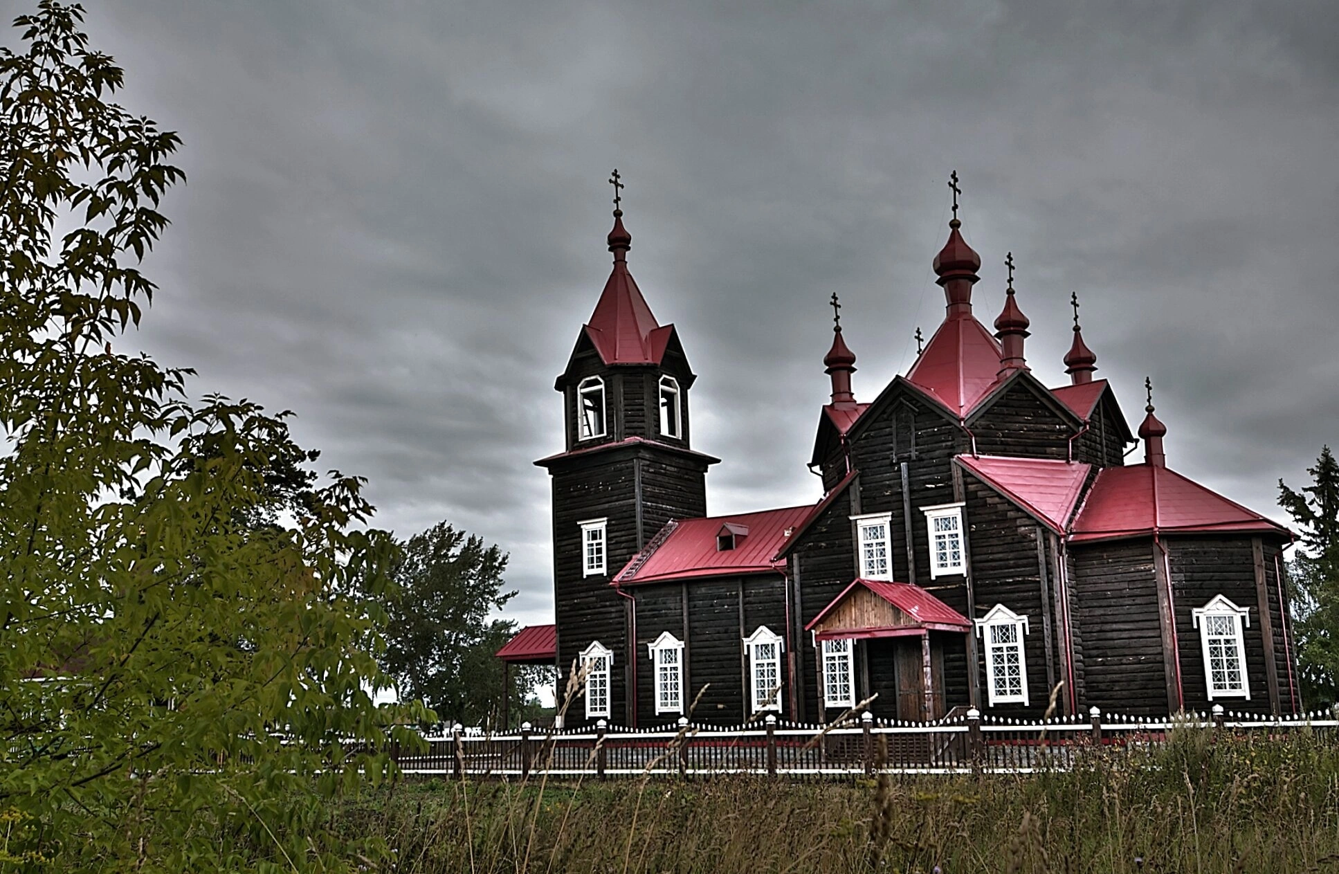 Храм обнесён невысокой деревянной оградой, которая символически отделяет священное пространство от мирского. На переднем плане фотографии видны заросли летней травы и молодые деревья, а на заднем плане открывается вид на сельский ландшафт. Пасмурное небо с облаками придает изображению особое, созерцательное настроение, подчёркивая умиротворённость и благодать этого святого места.