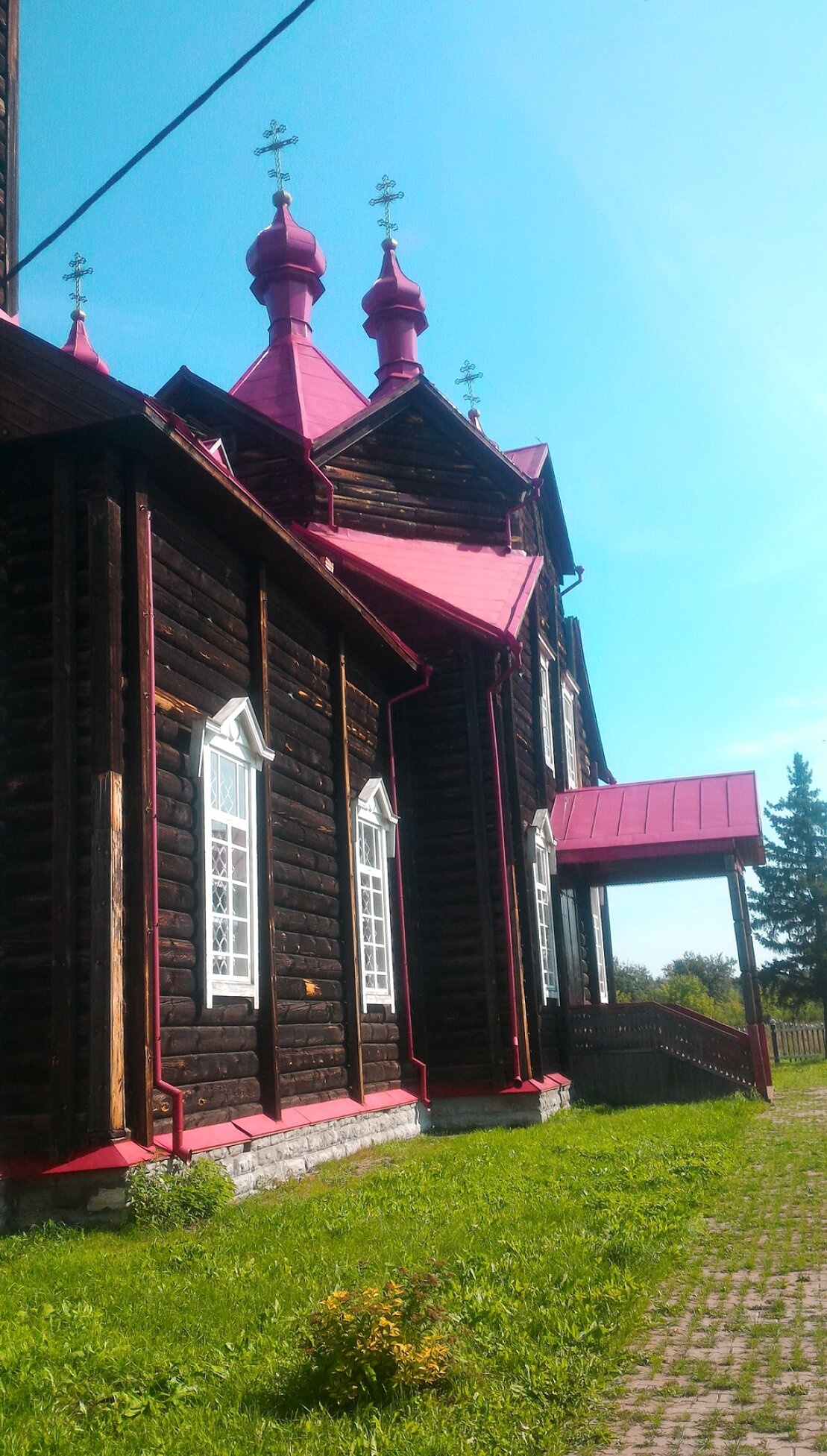 Архитектура храма представляет собой традиционный для русского зодчества образец. Здание сооружено из дерева, что подчёркивает его единение с природой и сибирскими просторами. Яркие красные кровли и купола, венчающие строение, создают яркий акцент в природном ландшафте, символизируя духовную радость и торжество православной веры в этом крае.